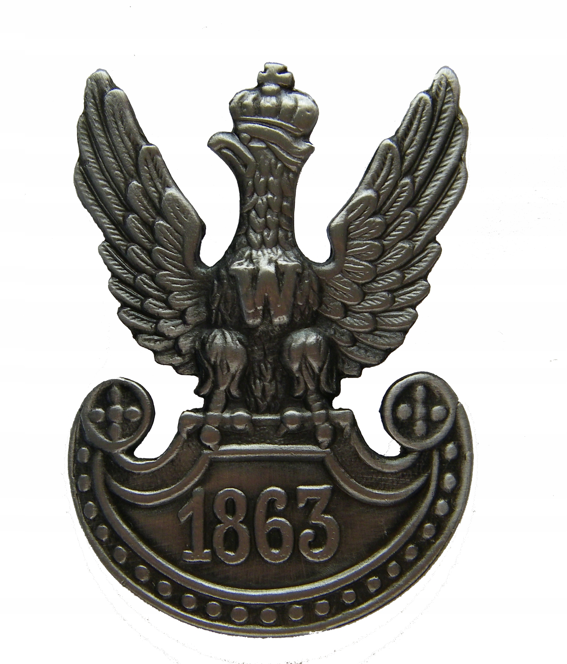 Представляємо вам вірну копію Орла ветеранів Січневого повстання. Вони носили орла на темно-синіх рогах з 1920 року. Основою орла був військовий зразок 19 з рельєфною літерою «W» на грудях і рельєфною датою «1863» на щиті. Розміри копії: ширина: 42 мм, висота: 59 мм. Відлитий у металі, оксидований у старому сріблі. Спосіб кріплення - за допомогою гвинтової кришки.