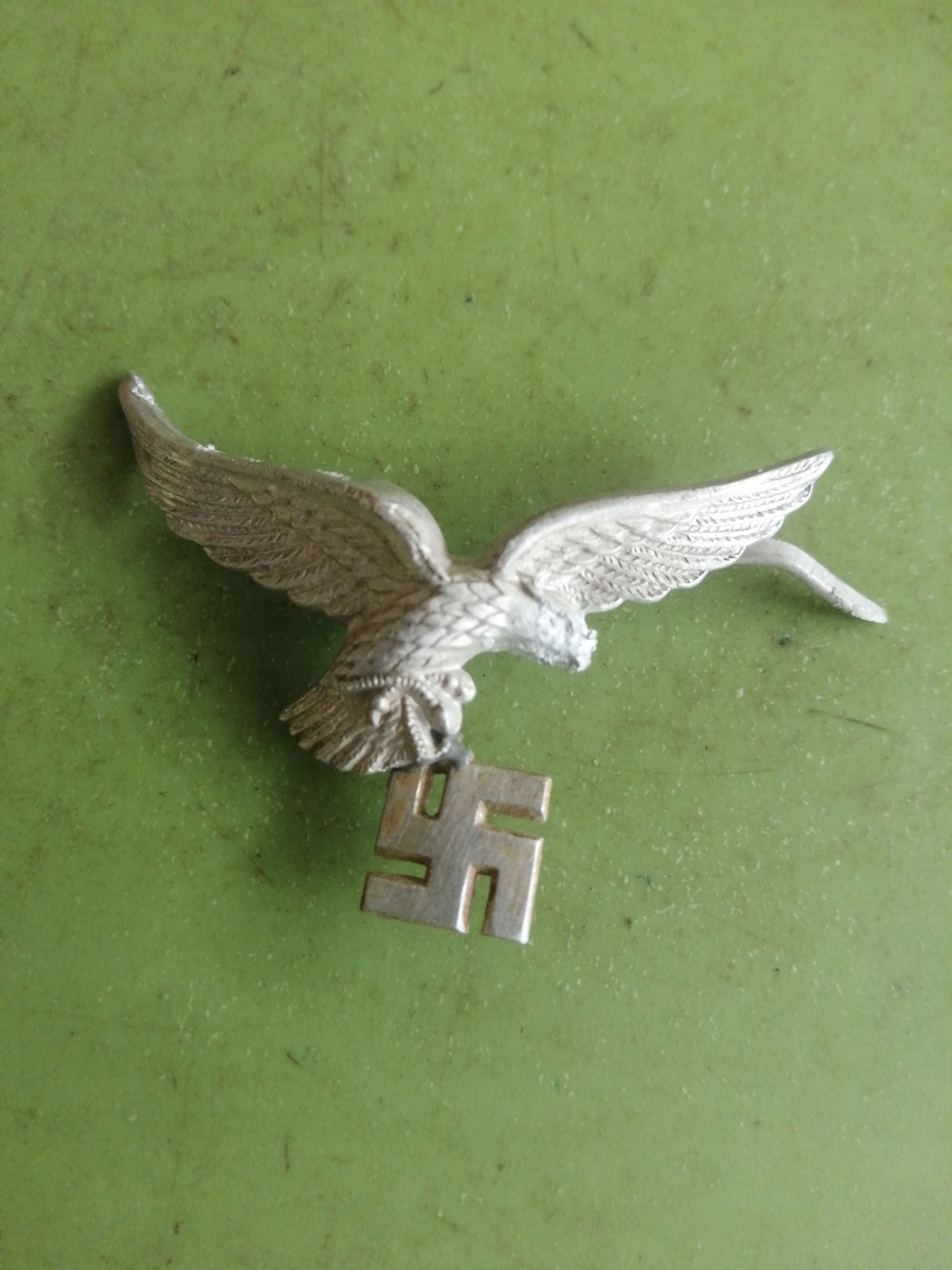 Я рекомендую оригінальний орел з пілотного капелюха Luftwaffe. Період Другої світової війни. Матеріал: Алюміній. Свастика забезпечений вторинним! - Закон 6 червня 1997 р. - Кримінальний кодекс, стаття 256 "Пропозиція фашизму або інша тоталітарна система або виклик ненависті", § 3 не порушує закон, пропонуючи предмет продажів для історичних чи колекціонерів. Примітка !! Він також не висловлює переконання та погляди продавця жодним чином. Він має лише історичну природу колекціонера. Це пропозиція для колекціонерів, а також членів реконструкції або фільмів.