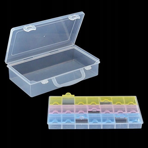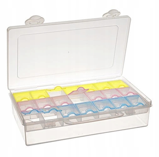 Органайзер пластиковий, з двох частин - складається з двох окремих контейнерів. У великій коробці знаходиться менша, яка має 21 маленьку клітинку розміром 3 х 3,5 см. Великий ящик однокамерний, оснащений ручкою і закривається двома засувками. Окремі коробки можна використовувати в комплекті або окремо.