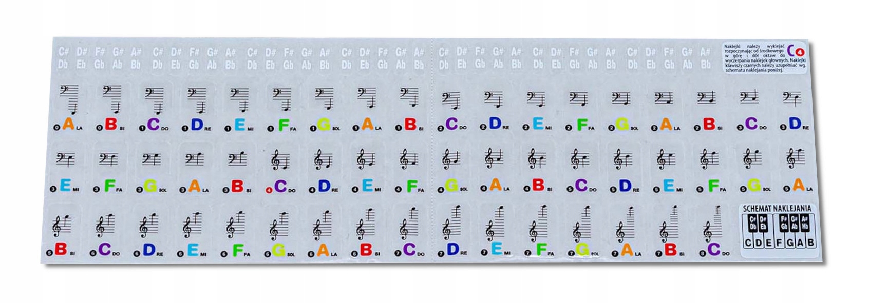 Барвисті стікери з прозорим фоном є неоціненною допомогою у вивченні гри. Наліпки містять ноти C-D-E-F-G-A-B, нотний запис і DO-RE-MI-FA-SOL-LA-SI-DO.
