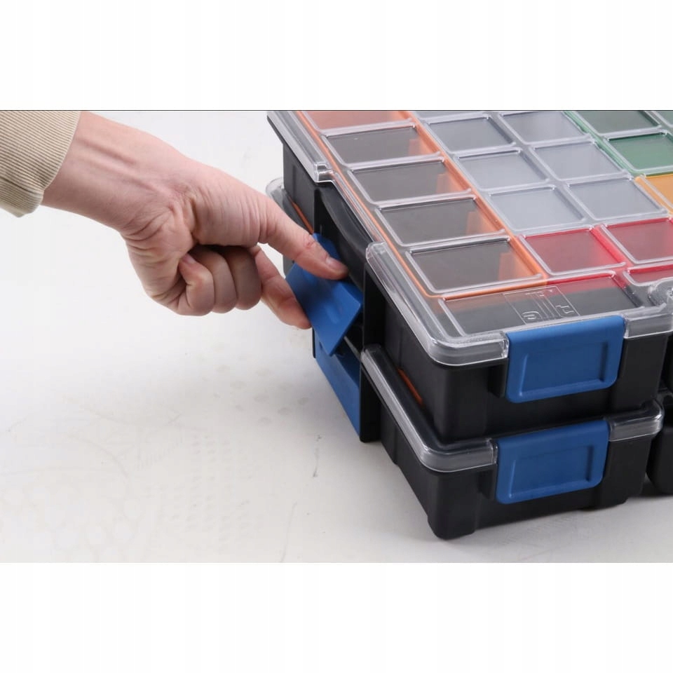 Інноваційний професійний органайзер для дрібниць, виготовлений із міцного пластику, із застібкою з трьох сторін. Завдяки ударостійкій полікарбонатній кришці та міцній основі органайзер забезпечує безпечне зберігання дрібниць. Інтер’єр можна налаштувати за допомогою внутрішніх баків висотою 63 мм і регульованих роздільників для гнучкої організації вмісту.