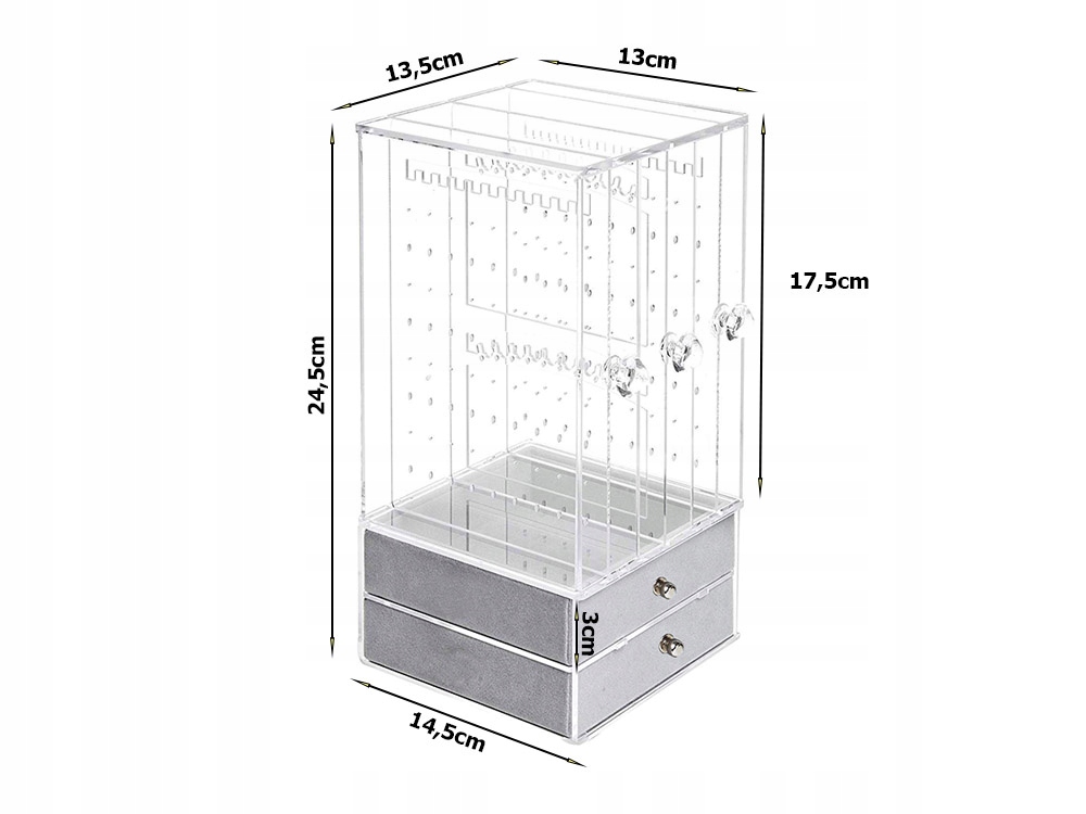 Верхня частина являє собою вітрину з трьома вертикальними ящиками, де дуже красиво виглядатимуть сережки, ланцюжки та браслети.