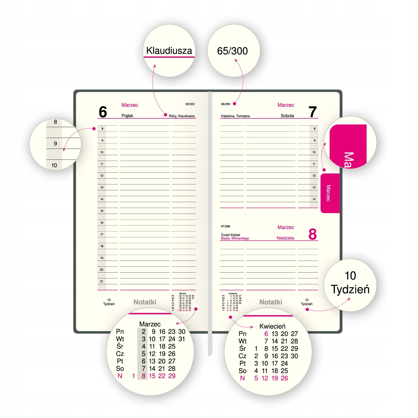 Вбудований маркер сторінки дозволяє негайно знаходити важливі примітки або останню завершену сторінку. Календар польською, англійською та українською мовами містить нумерацію днів і тижнів і подвійні іменини, що ще більше підвищує його корисність.