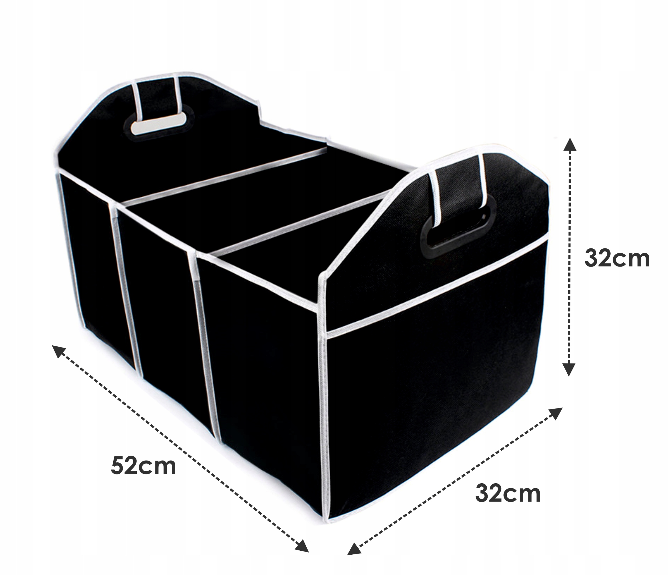 Міцний складаний органайзер для багажника, розділений на три великі відділення зі зручними посиленими ручками для перенесення, розташованими на коротких сторонах.