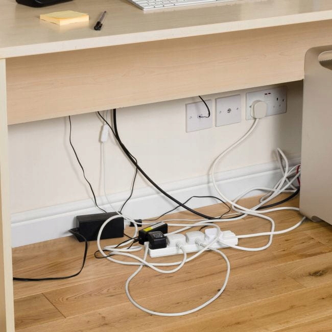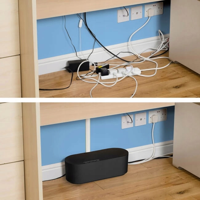 Чорний кабельний органайзер – це швидкий спосіб упорядкувати електричні кабелі. Він приховує клубок проводів і популярний розгалужувач на 4 входи. Виготовлений з безпечного і нетоксичного матеріалу - ABS пластику. Він має 3 задні кабельні входи/виходи та відповідає вимогам стандарту BS EN 60670-22:2006 для електричних аксесуарів.