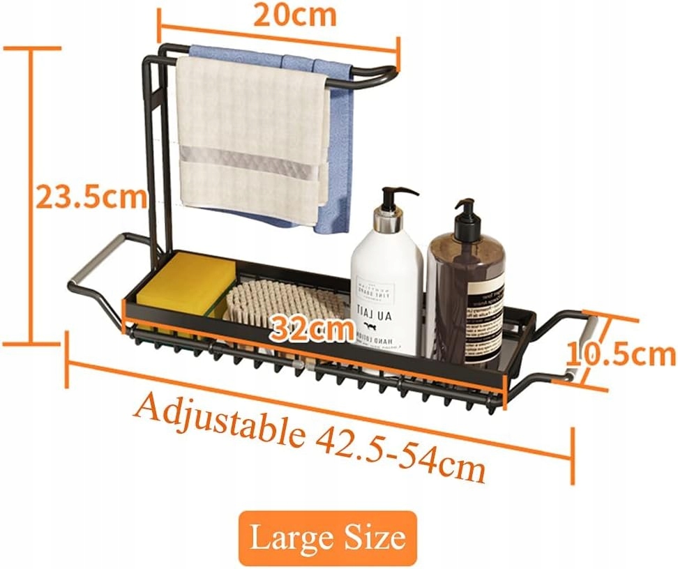 - Розсувна конструкція --- Цю полицю для зберігання кухонних мийок можна вільно розсунути від 42,5 см до 54 см залежно від довжини раковин. 2 штанги корисні для підвішування ганчірок для посуду.