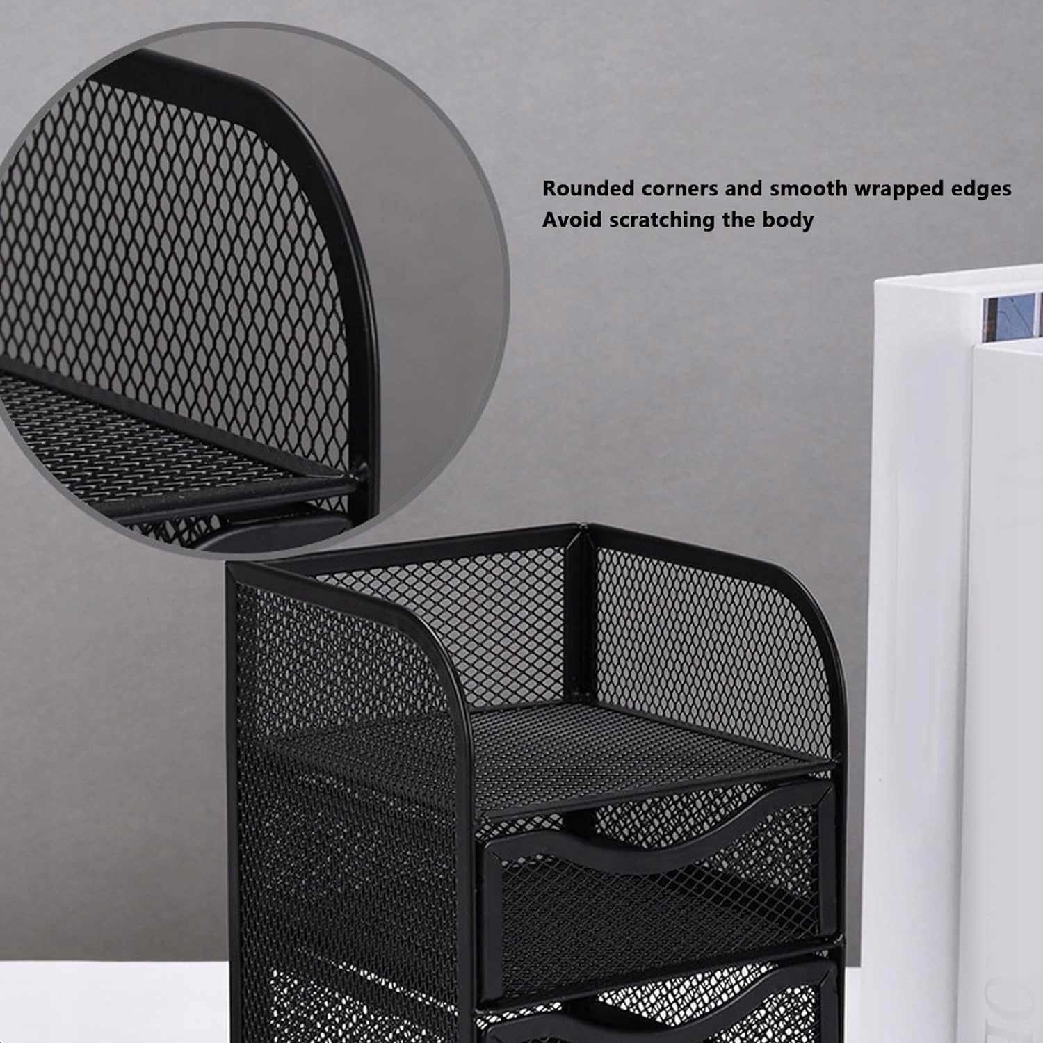 Настільний лоток для органайзера документів ВЕЛИКОЇ ЄМНОСТІ має сітчастий візерунок із чистою естетикою для елегантного промислового вигляду. Завдяки 4 відділенням вистачить місця для того, щоб розмістити необхідні речі. БАГАТОФУНКЦІОНАЛЬНИЙ настільний органайзер ідеально підходить для зберігання канцелярського приладдя, а також для організації пензликів для макіяжу, лаку для нігтів, губної помади та інших окремих предметів, відсортованих за типом. 3 висувні шухляди доступні для ваших щоденних потреб у зберіганні ІДЕАЛЬНИЙ РОЗМІР Настільний органайзер має розміри 205 x 128 x 125 см гарного розміру, він не займає надто багато місця на прилавку та досить непомітний. Це заощадить місце в канцтоварах і робочій зоні, а також зробить неохайним робочий стіл. ВИСОКА ЯКІСТЬ МЕТАЛ Настільний органайзер виготовлений з добірної металевої сітки з функцією протиковзання. КОНСТРУКЦІЯ Міцна та придатна для тривалого використання. Органайзер піднос ідеально підходить для зберігання книг, журналів, листів і паперу. СУЧАСНИЙ ВИД Глянцевий дизайн цього органайзера додає вашому робочому простору сучасний відтінок. Він доповнює будь-який декор, покращує естетичність столу та полегшує роботу.