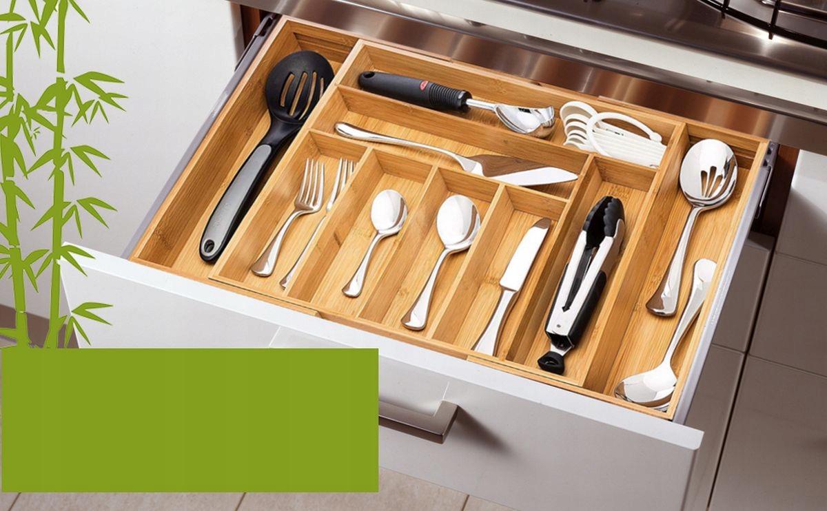 Бамбуковий органайзер з багатьма відділеннями допоможе упорядкувати вашу шухляду. Відсортовані речі не тільки радують око, але й вирішують надокучливу проблему переплутаних столових приборів! Збільште свій простір за допомогою нашої вставки для ящиків
