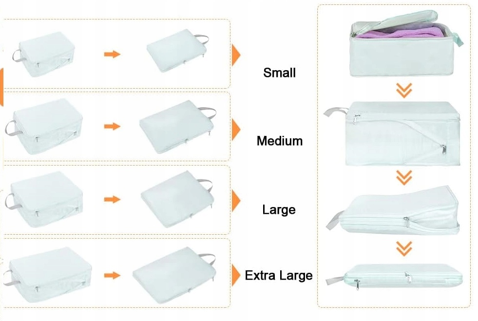 Компресійні сумки - надзвичайно практичний спосіб зменшити об'єм вашого багажу, дозволяючи взяти все необхідне в подорож. Кожна сумка має різний розмір, що дозволяє використовувати органайзери у великій валізі, ручній поклажі та рюкзаку.