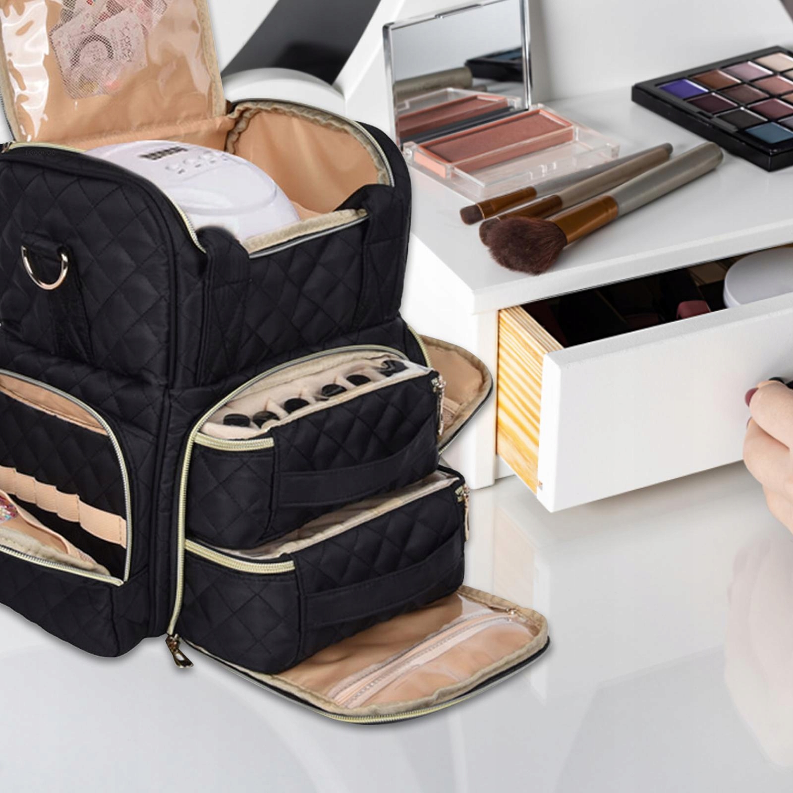 • Верхній шар: зберігає професійну світлодіодну лампу, електричну дриль для нігтів, засіб для зняття лаку та манікюрний набір.