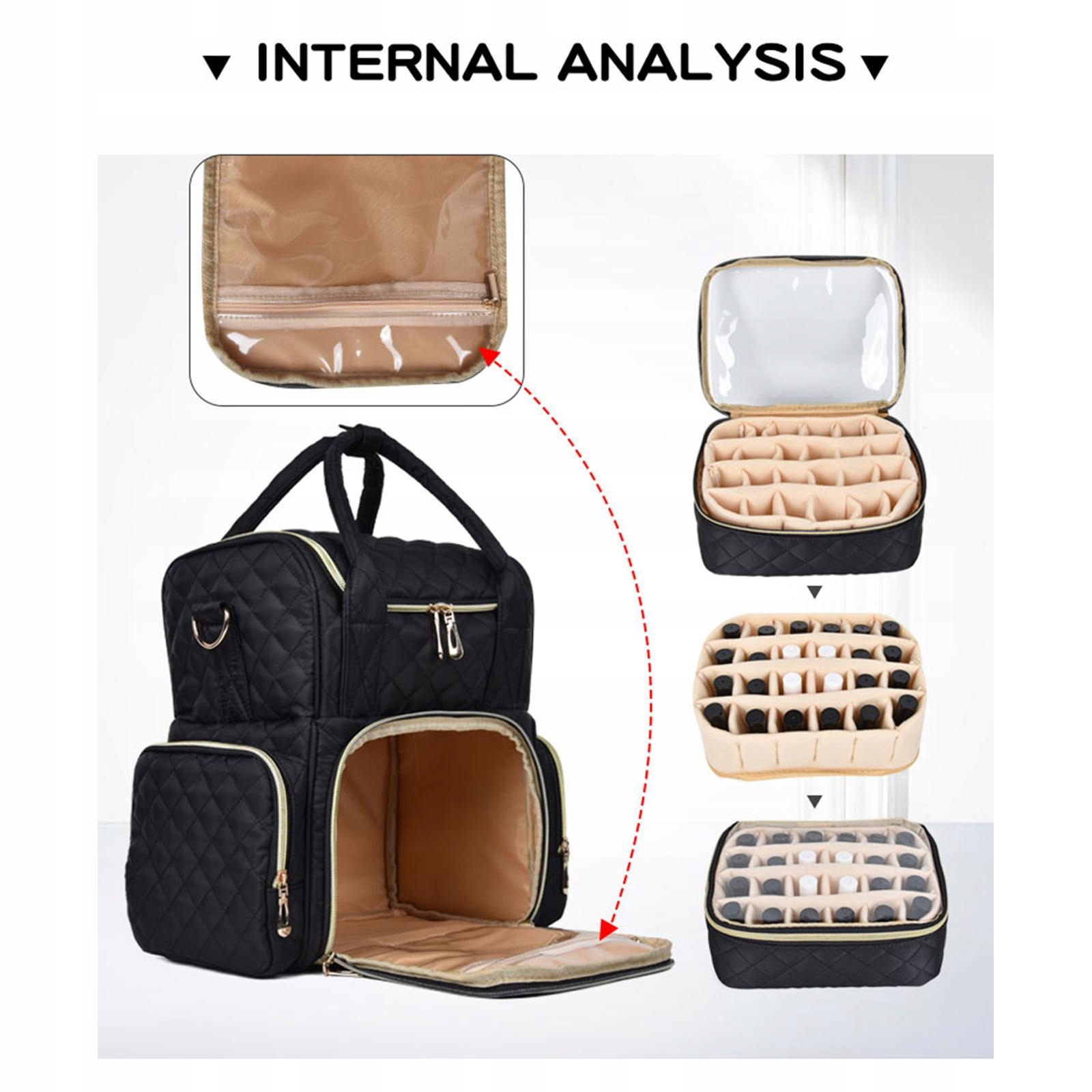 •Нижній рівень: містить два знімних футляри, які вміщують до 48 пляшечок лаку для нігтів кожен.