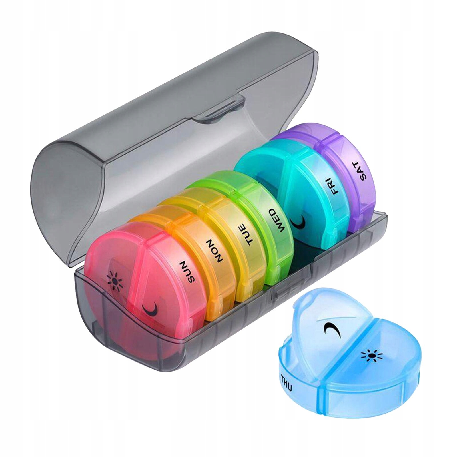 Поза допомогою одноденних ліків: 7 окремих щоденних коробок 7 кольорів дозволяють вам вислизнути один або кілька днів ліки, щоб прийняти, коли вас немає. Кожна щоденна коробка може вмістити до 6 риб олії або 14 капсул