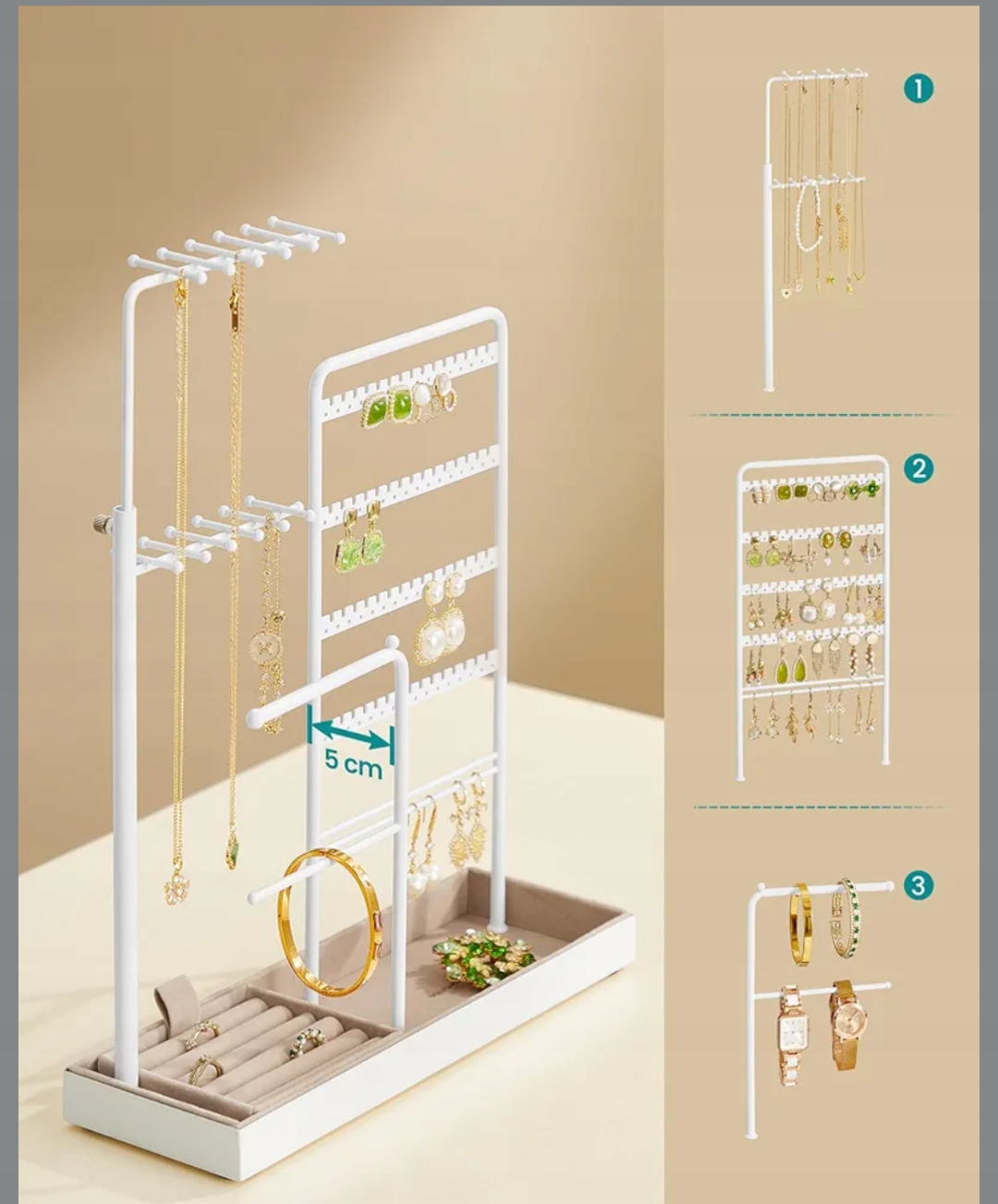 - Просторий і організований: отвори та слоти для 46 пар сережок або паличок; 3 злитки на 20 браслетів, браслетів або годинників; гачки для 24 намиста; лоток у нижній частині для кілець, губної помади, брошок, шпильок тощо.