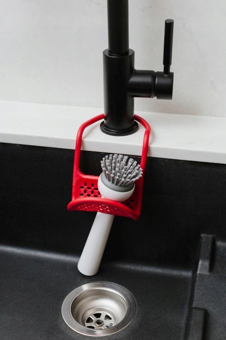 Органайзер для раковини Saddle від Umbra дозволяє впорядкувати засоби для чищення, губки та ганчірки, які зазвичай знаходяться біля раковини, в одному місці.
