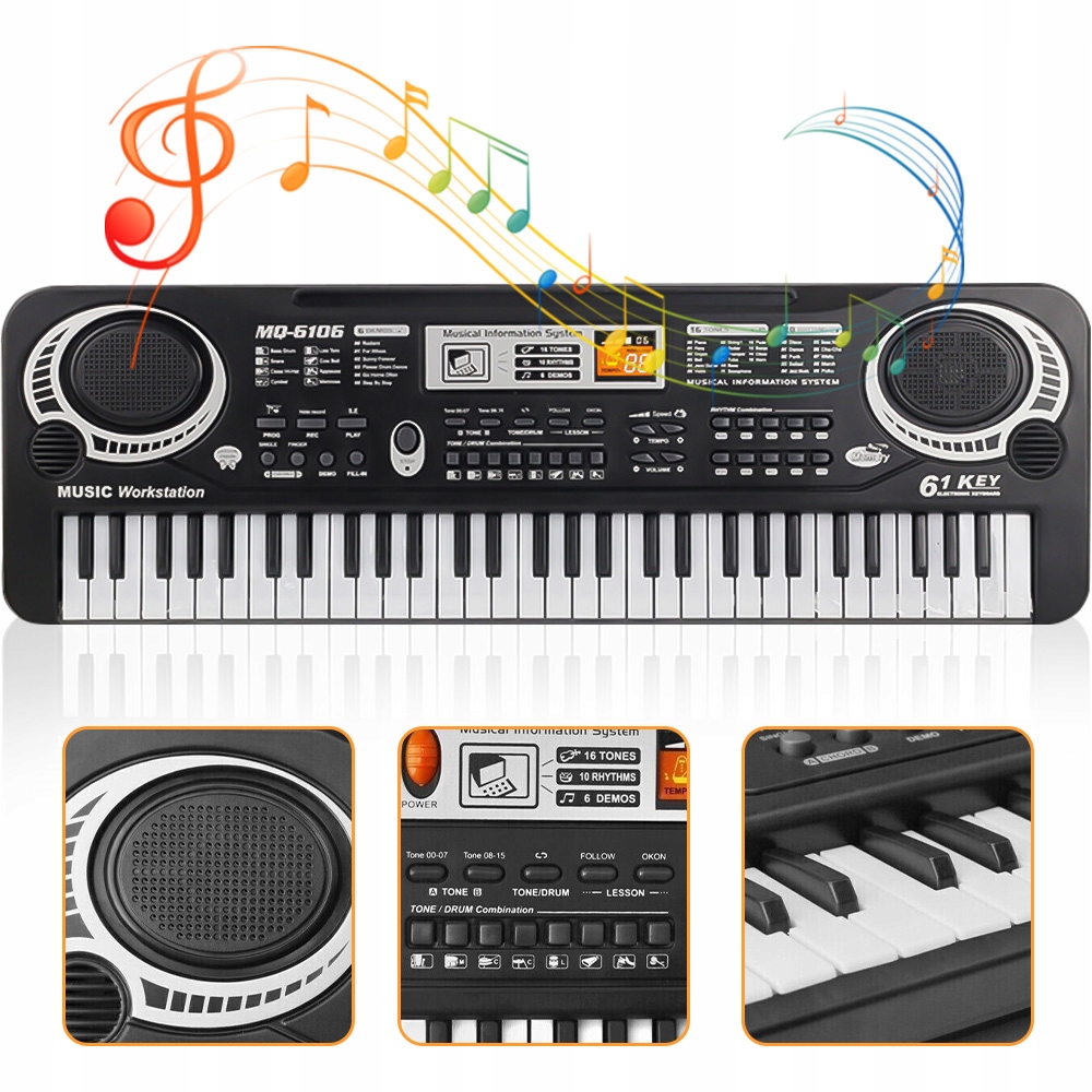 Кожна електрична клавіатура 61-клави містить 128 кольорів / 128 ритмів / 8 барабанів / 12 демонстраційних творів / 61 барабани на клавіатурі.