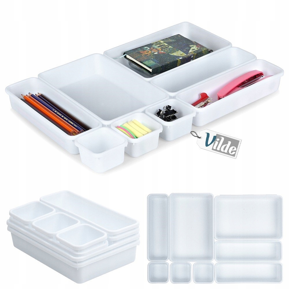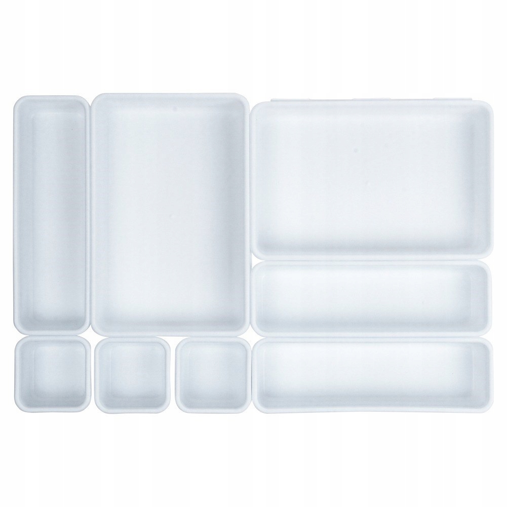 набір з восьми організаторів для ящика, у трьох різних розмірах. Контейнери можна поєднувати один з одним. Ідеально підходить для зберігання офісних аксесуарів, невеликих предметів гардеробу або косметики та ювелірних виробів.