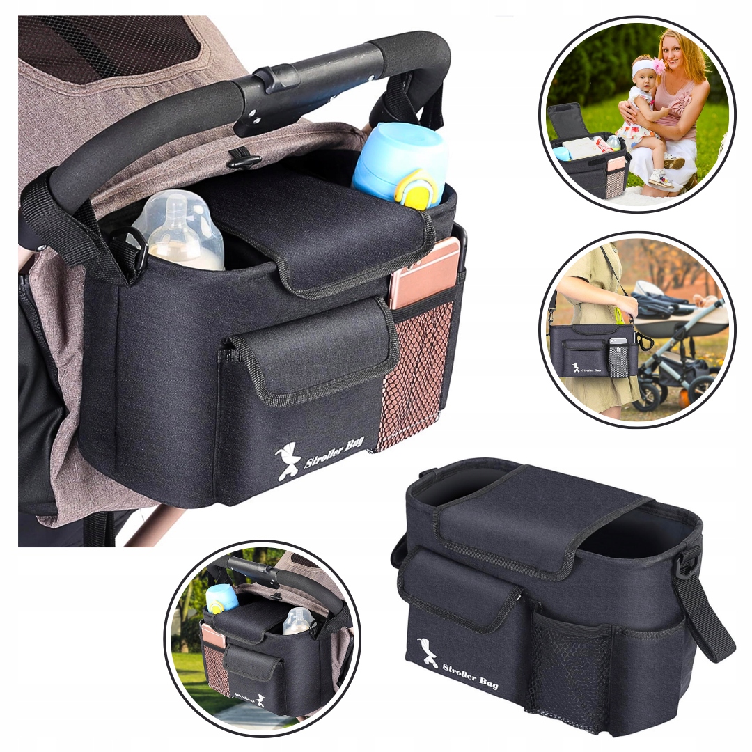 Організатор для дитячої коляски, Універсальний мішок для дитячої коляски, організатор зберігання з кріпленнями гачків, ремінь для плечей, пляшок, шарфів, мобільних телефонів, чорного