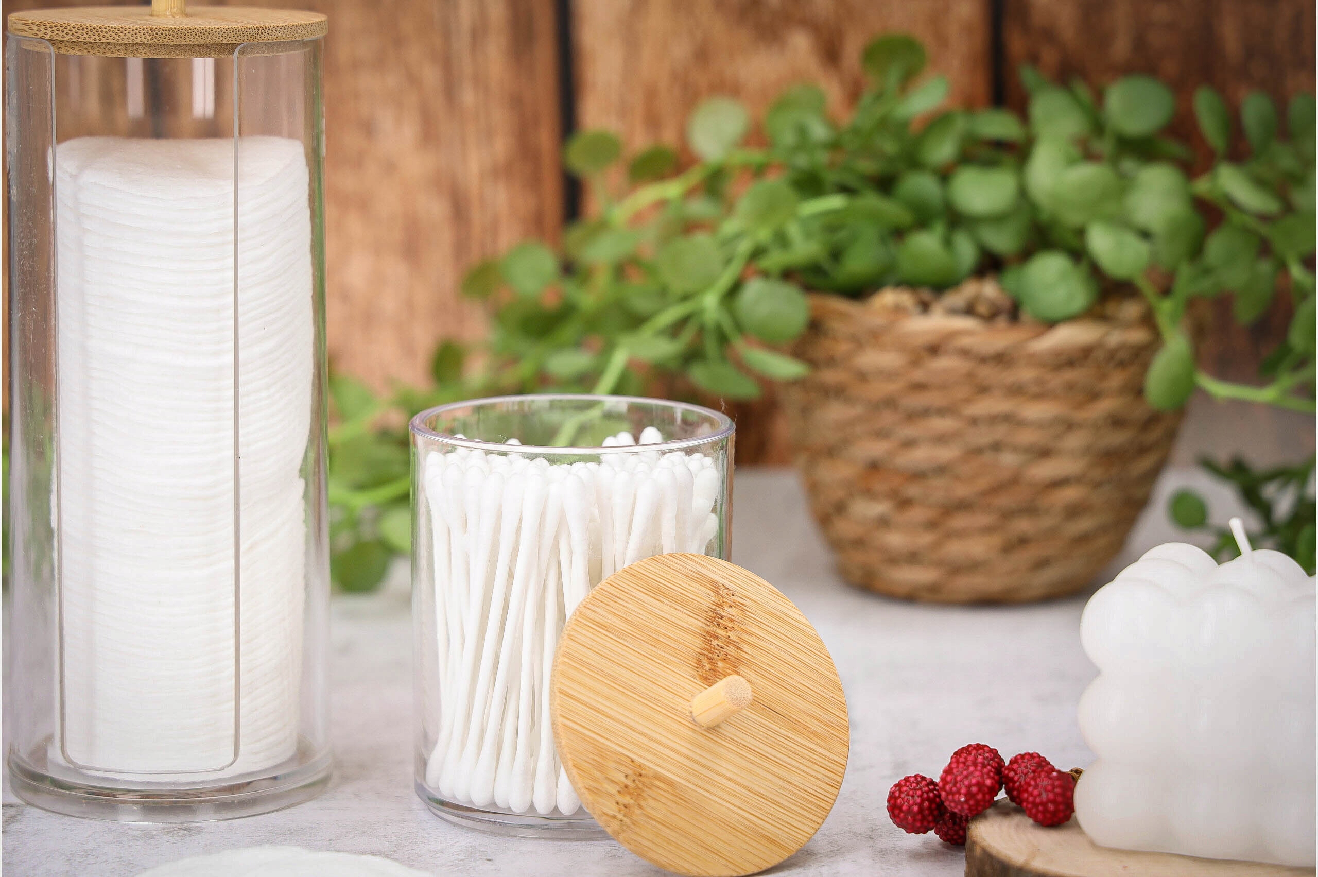 ✅ Практичний контейнер для зберігання ватних паличок з прозорого акрилу та бамбукового дерева.