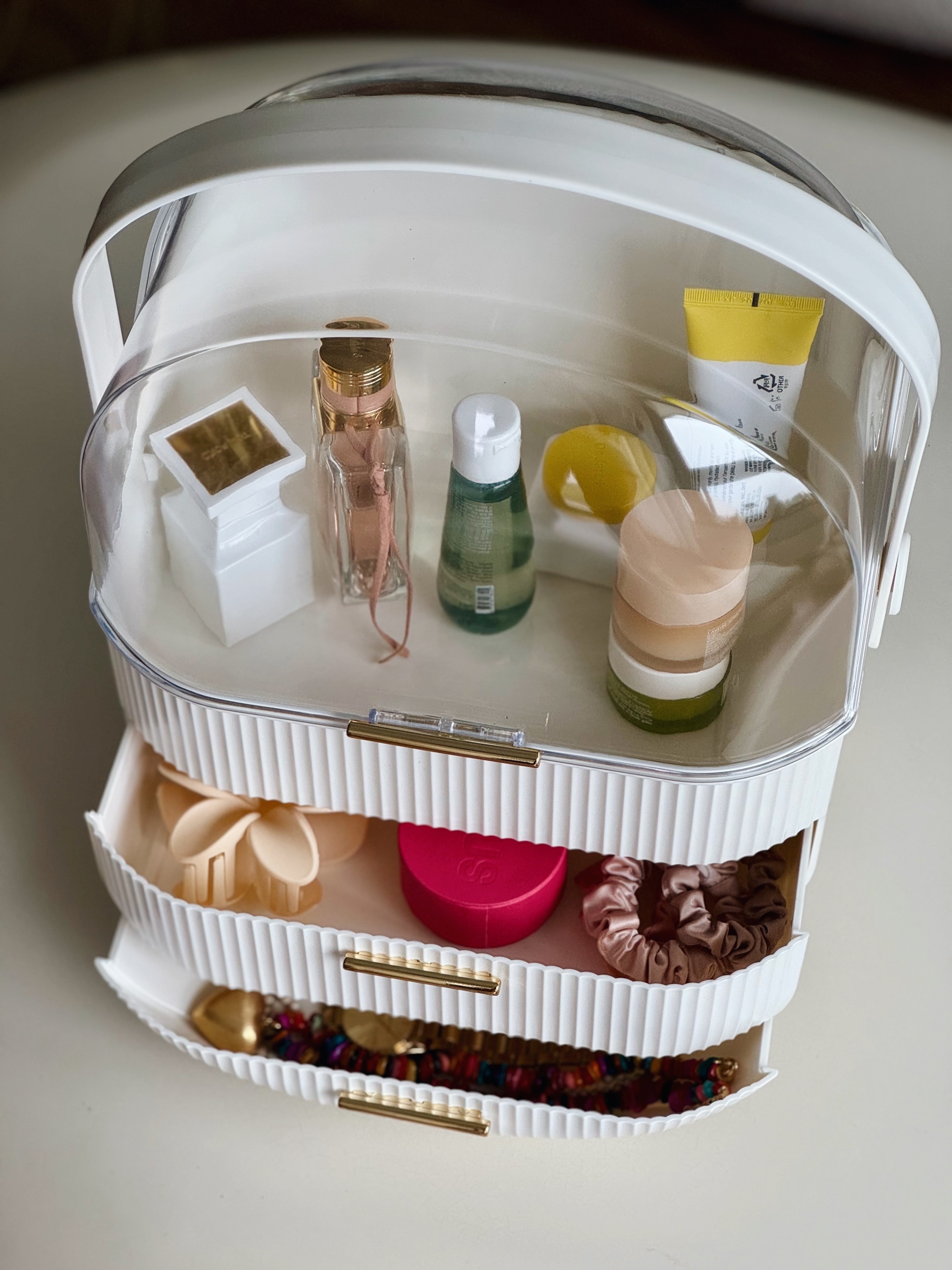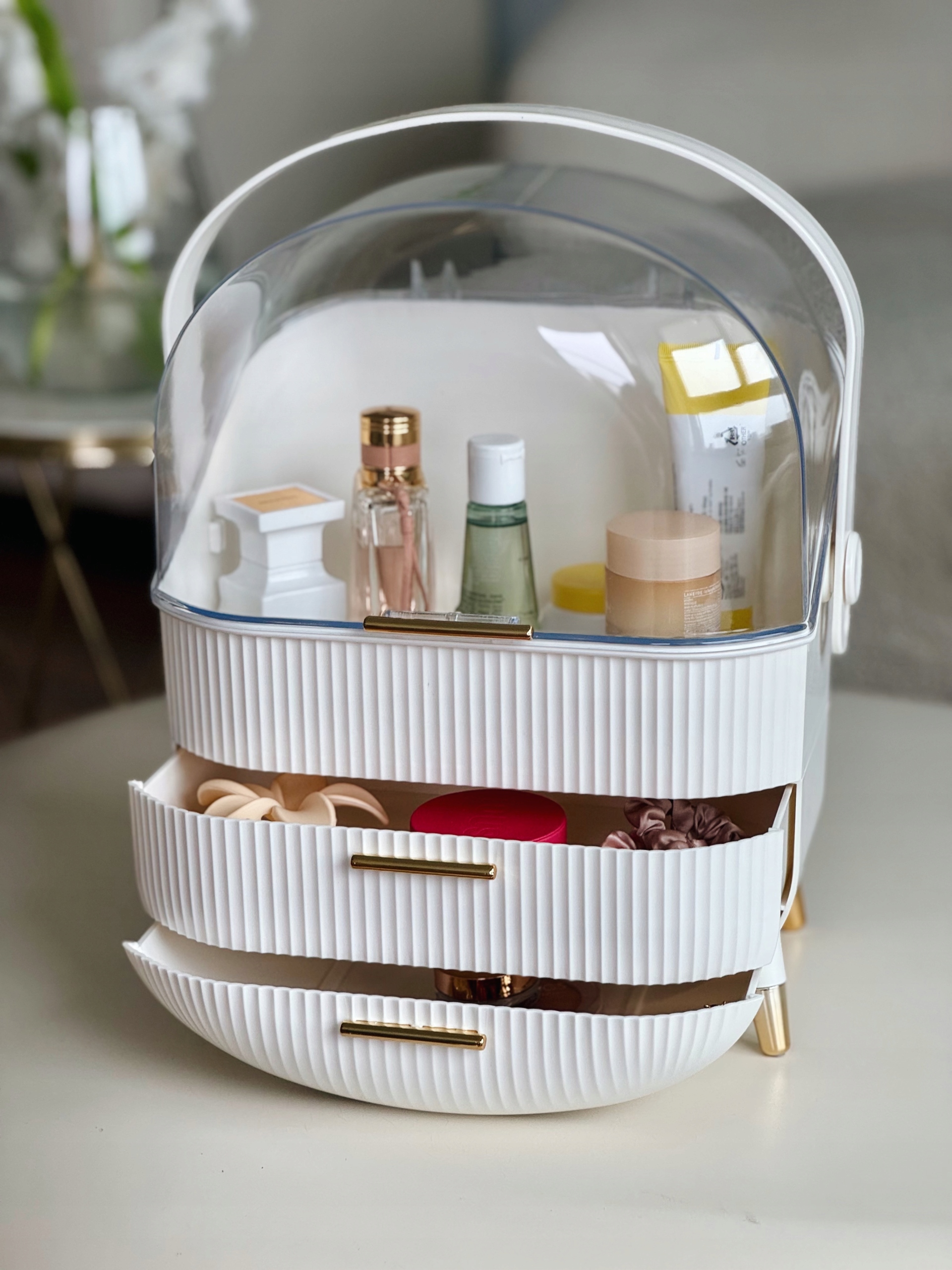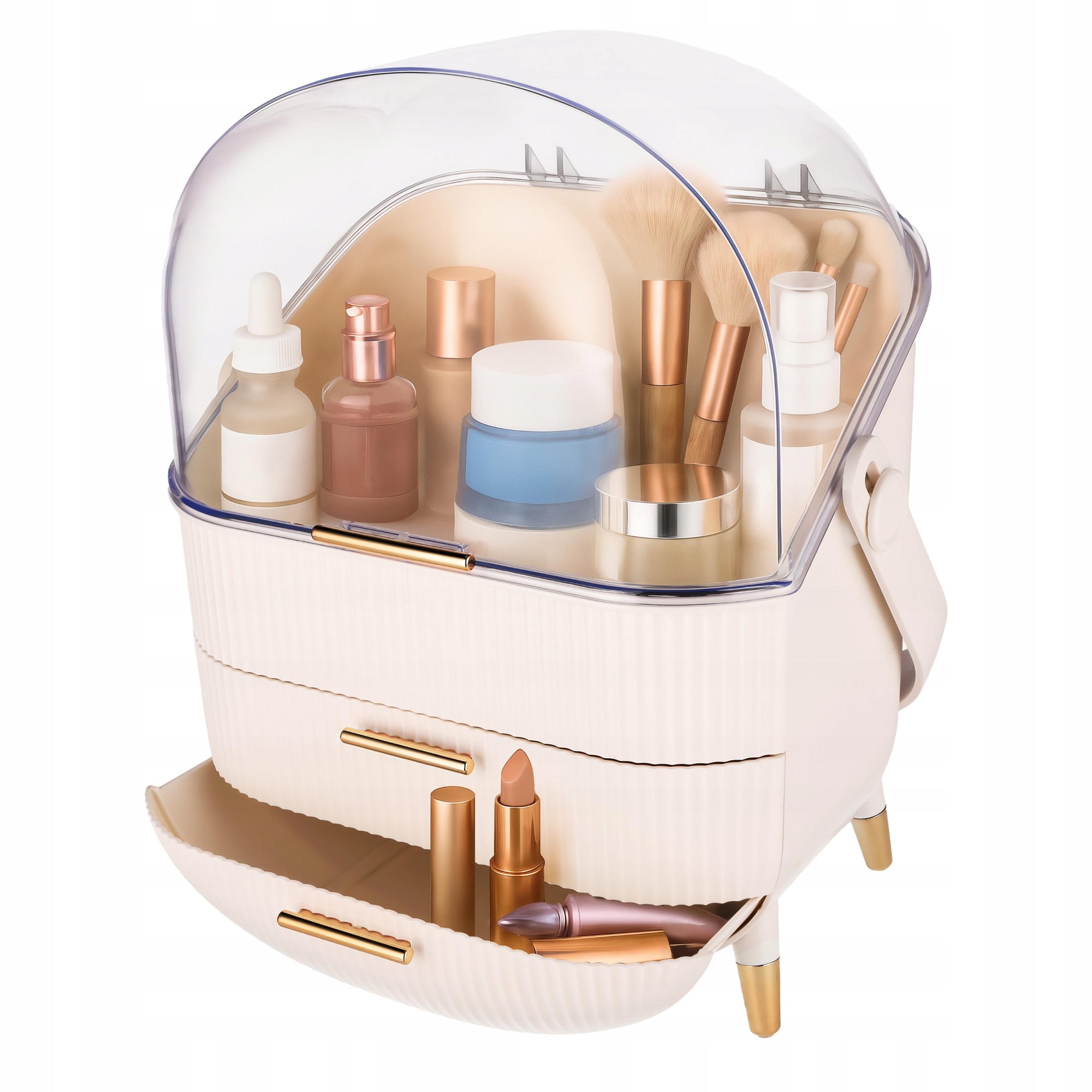 - ✨ Цей практичний органайзер для косметики - це рішення, яке поєднуєфункціональність з естетикою. Завдяки багаторівневій конструкції з висувними ящиками та кришкою, що відкривається, ви можете помістити всі ваші улюблені продукти - від лаків для нігтів до великих флаконів тоніка чи парфумів.