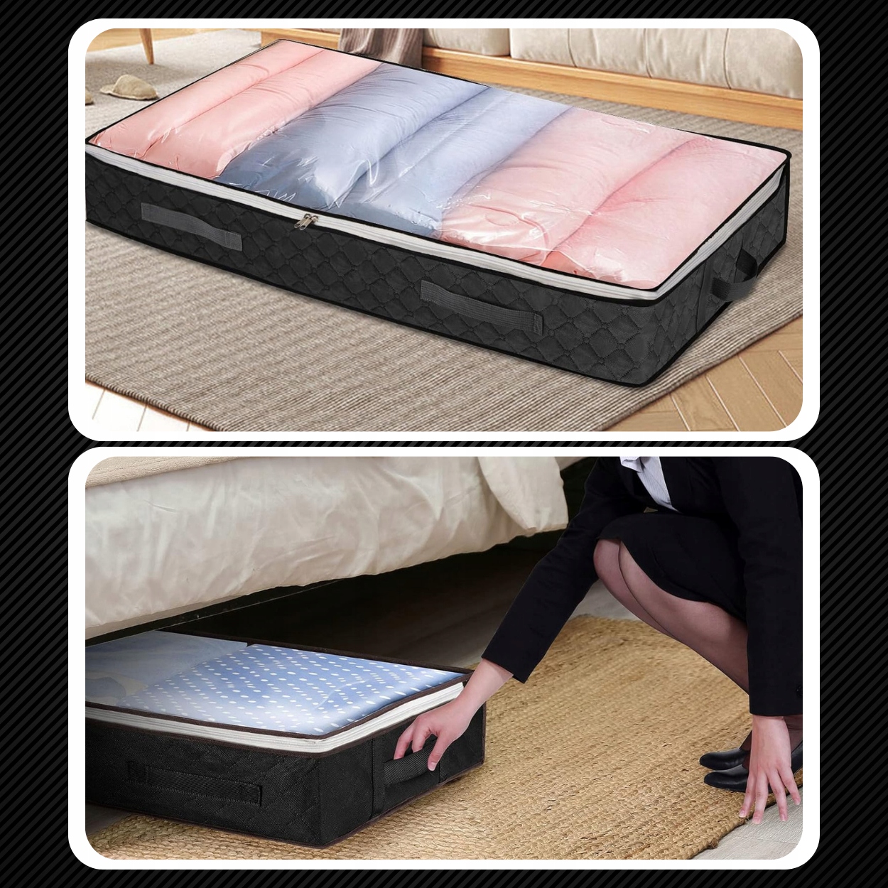 Обкладинка ідеально підходить для зберігання постільних постій, ковдр, одягу, навіть подушок та куртків. Завдяки великій ємності, це дозволяє зберігати порядок у шафі, під ліжком або в гардеробі. Він також добре працює для зберігання рушників, нижньої білизни та сезонного одягу. і комахи, такі як моль. Завдяки цьому, ваша постільна білизна, одяг та інший текстиль залишатимуться чистими та в ідеальному стані протягом року. виготовляється з високої якості нехвеного та поліестеру, які стійкі до вологи. Це забезпечує довговічність та захист збережених предметів, навіть у місцях, більш вразливих до вологи, таких як підвали або горища.