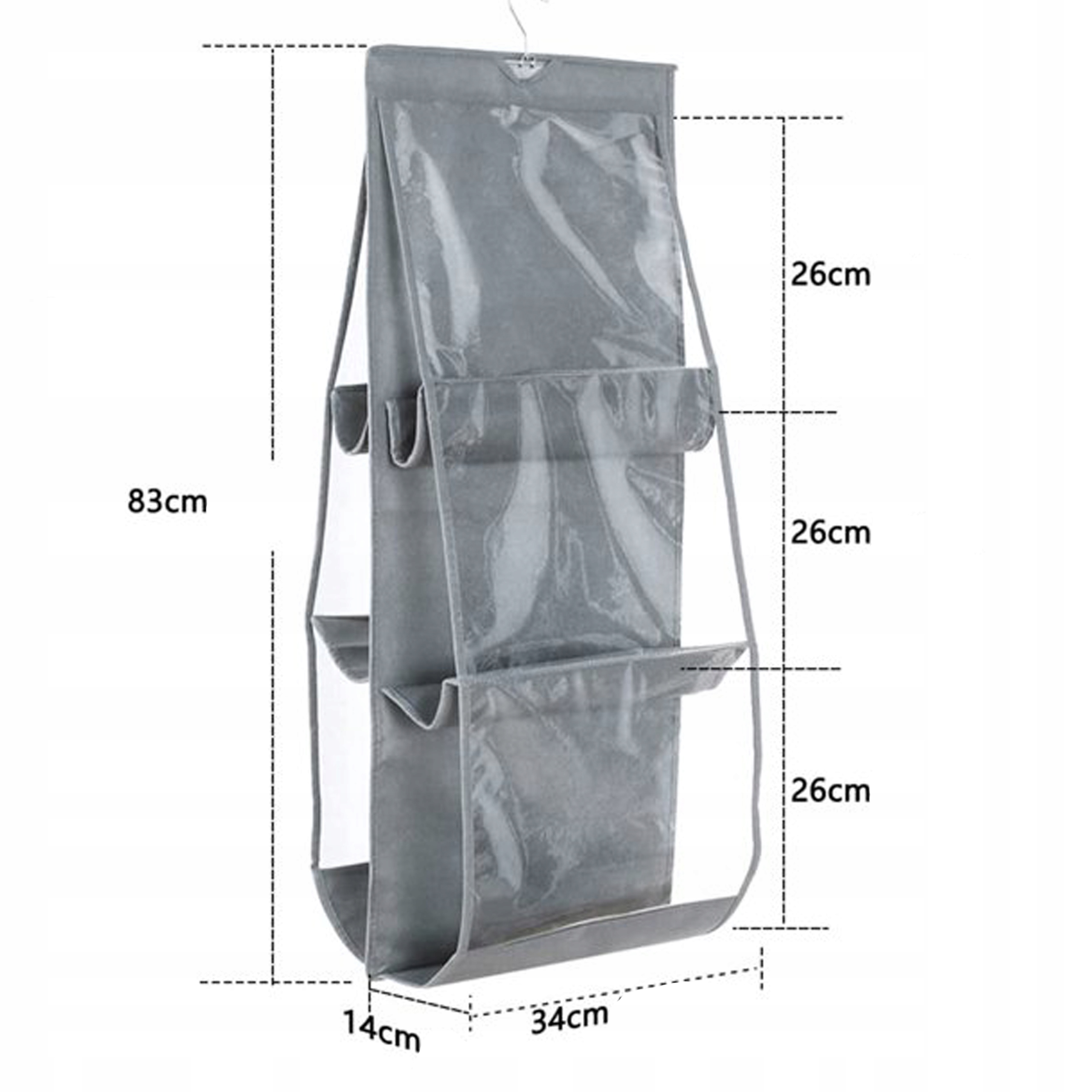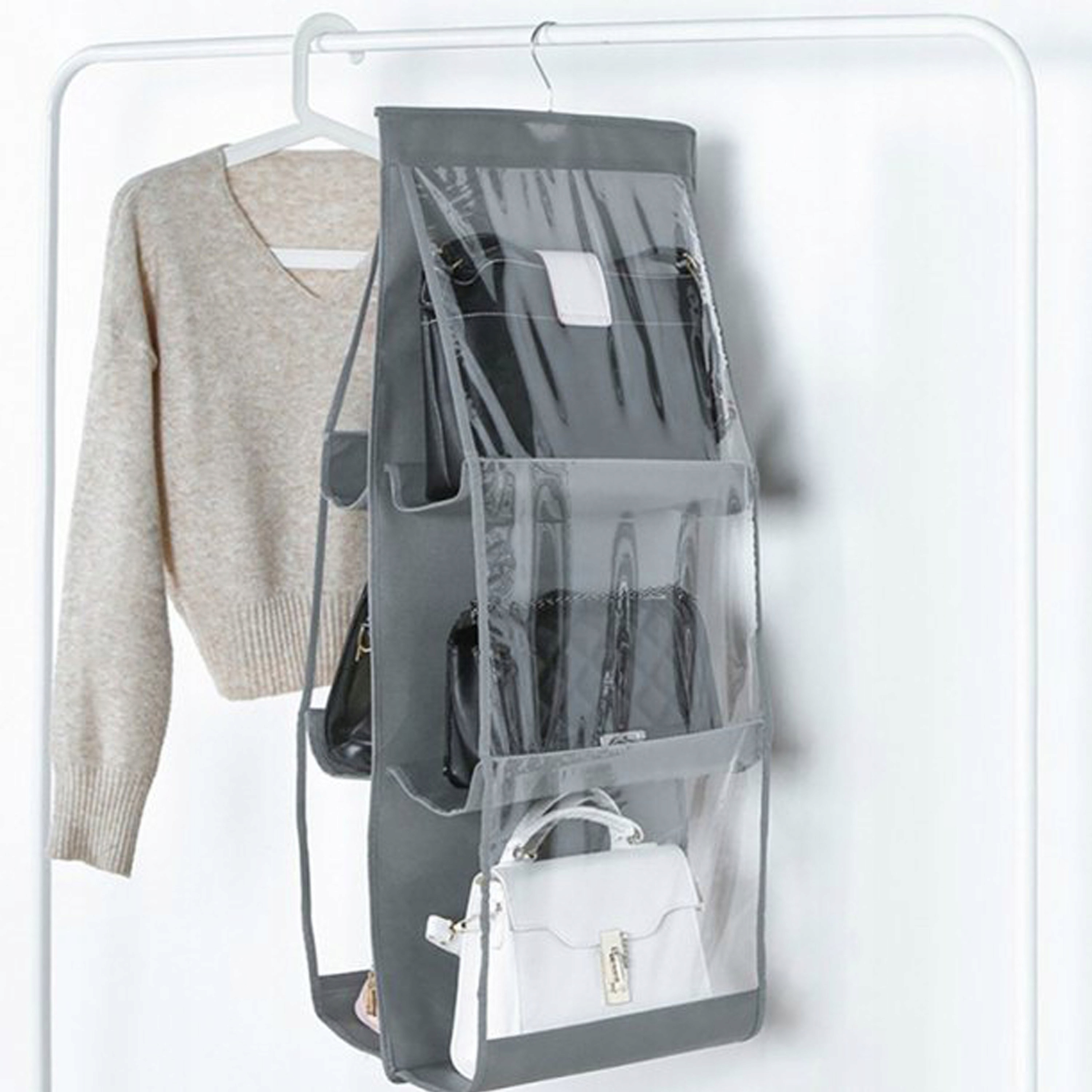Двосторонній сумочний органайзер - ідеальне рішення для людей, які цінують порядок у своєму гардеробі. Містить аж 6 відділень, у які помістяться навіть найбільші сумки. Органайзер для сумочки також може містити взуття, гаманці, іграшки, рушники тощо. Ви можете використовувати його буквально на будь-чому. Він має вішалку, завдяки якій ви можете повісити органайзер, наприклад, у своїй шафі.