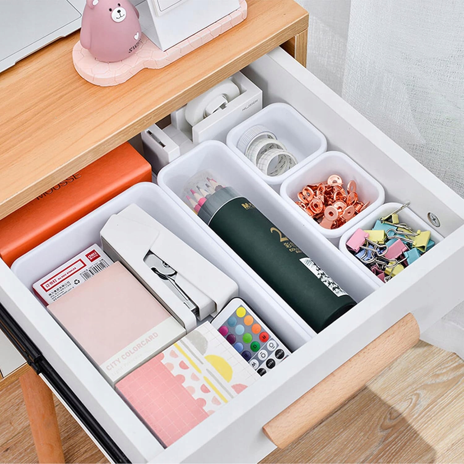 Уявіть собі шухляду, у якій кожен предмет має окремий контейнер. Столові прибори не переплутаються з батарейками, ручка не йде у ванну, а скріпки не губляться під купою квитанцій. З нашим набором із 8 модульних органайзерів ви впорядкуєте простір на кухні, у ванній кімнаті, в офісі чи майстерні за кілька хвилин - і він залишатиметься організованим протягом тривалого часу.