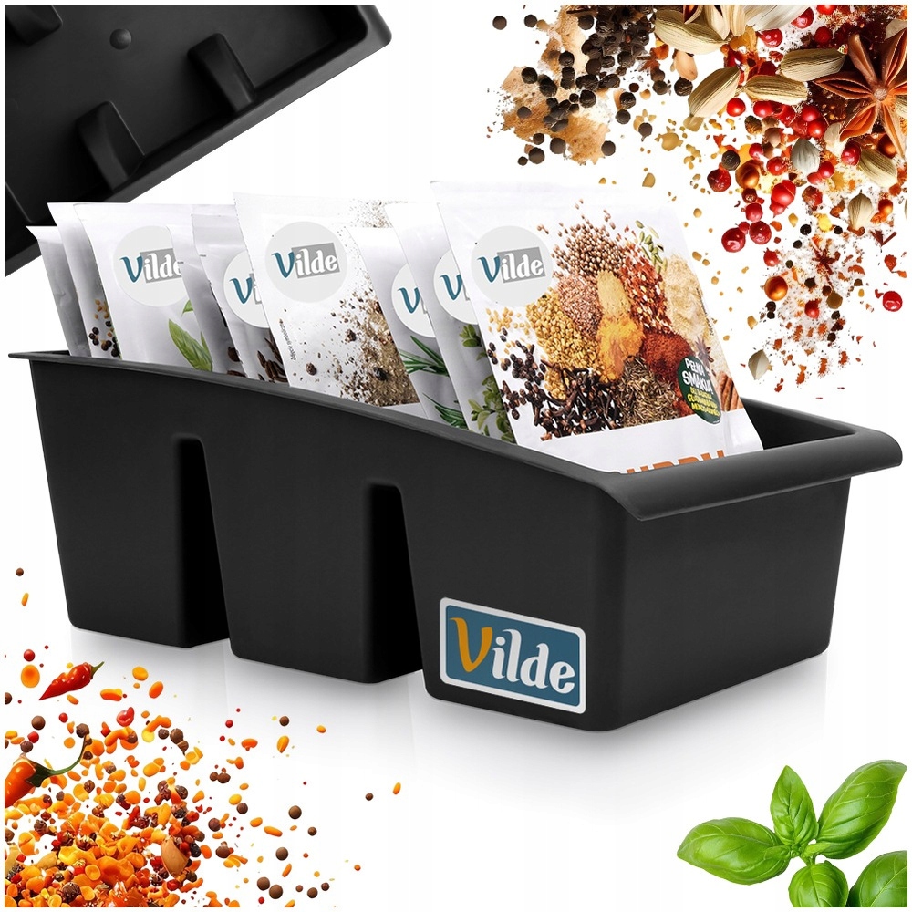 Кухонний контейнер для спецій в пакеті. Міцно виготовлений зі світлого чорного матеріалу. З його допомогою ви підтримуватимете порядок у шафі зі спеціями. Завдяки цьому ви можете сортувати спеції і завжди мати даний продукт під рукою. Ви швидко знайдете потрібну сумку. Контейнер дозволяє зберігати пакет у відділенні, що запобігає розсипанню спецій. Спеції і трави будуть утримуватися в порядку, а один організатор буде містити багато пакетів з різними продуктами. Оригінальний продукт Vilde. Вироблено відповідно до європейських стандартів.