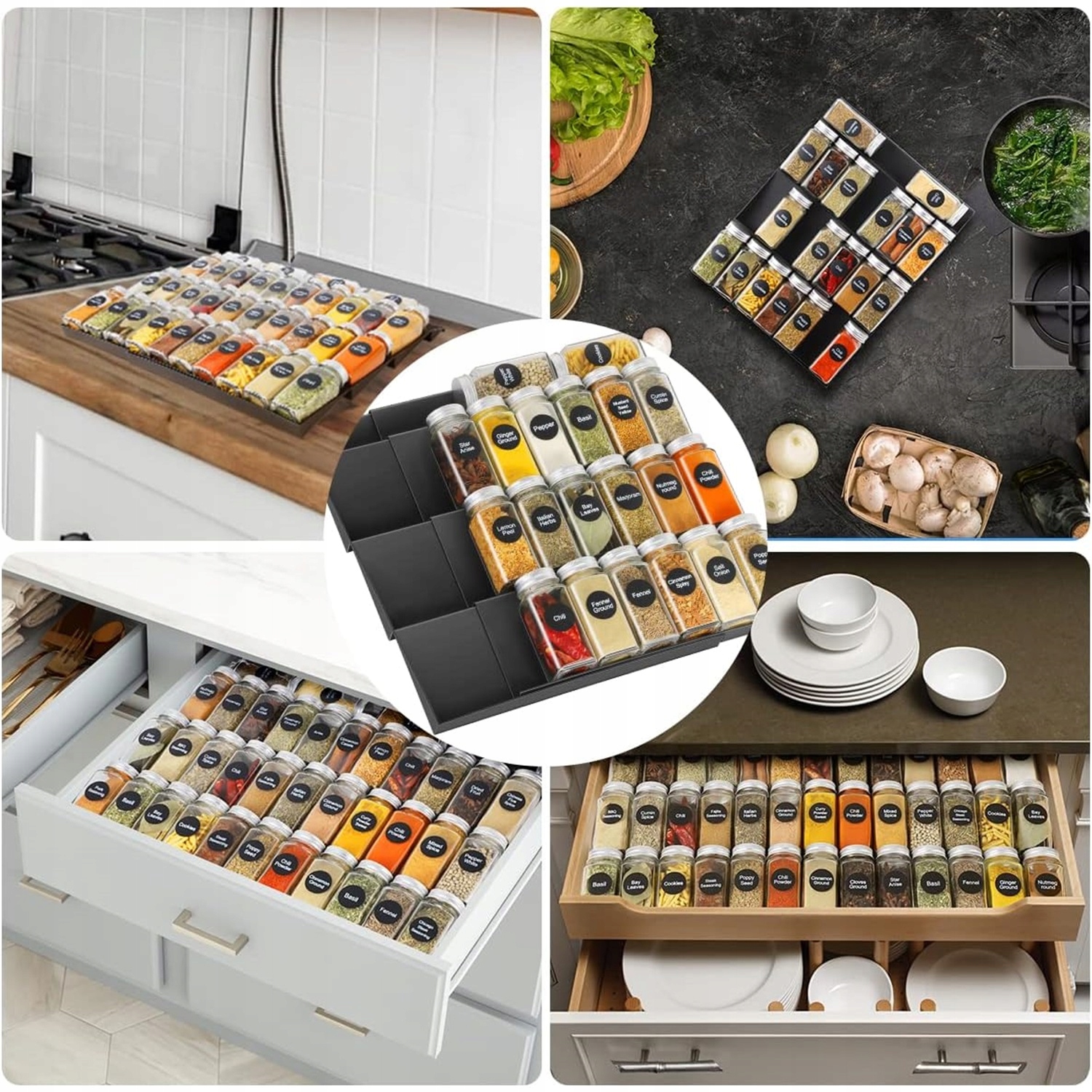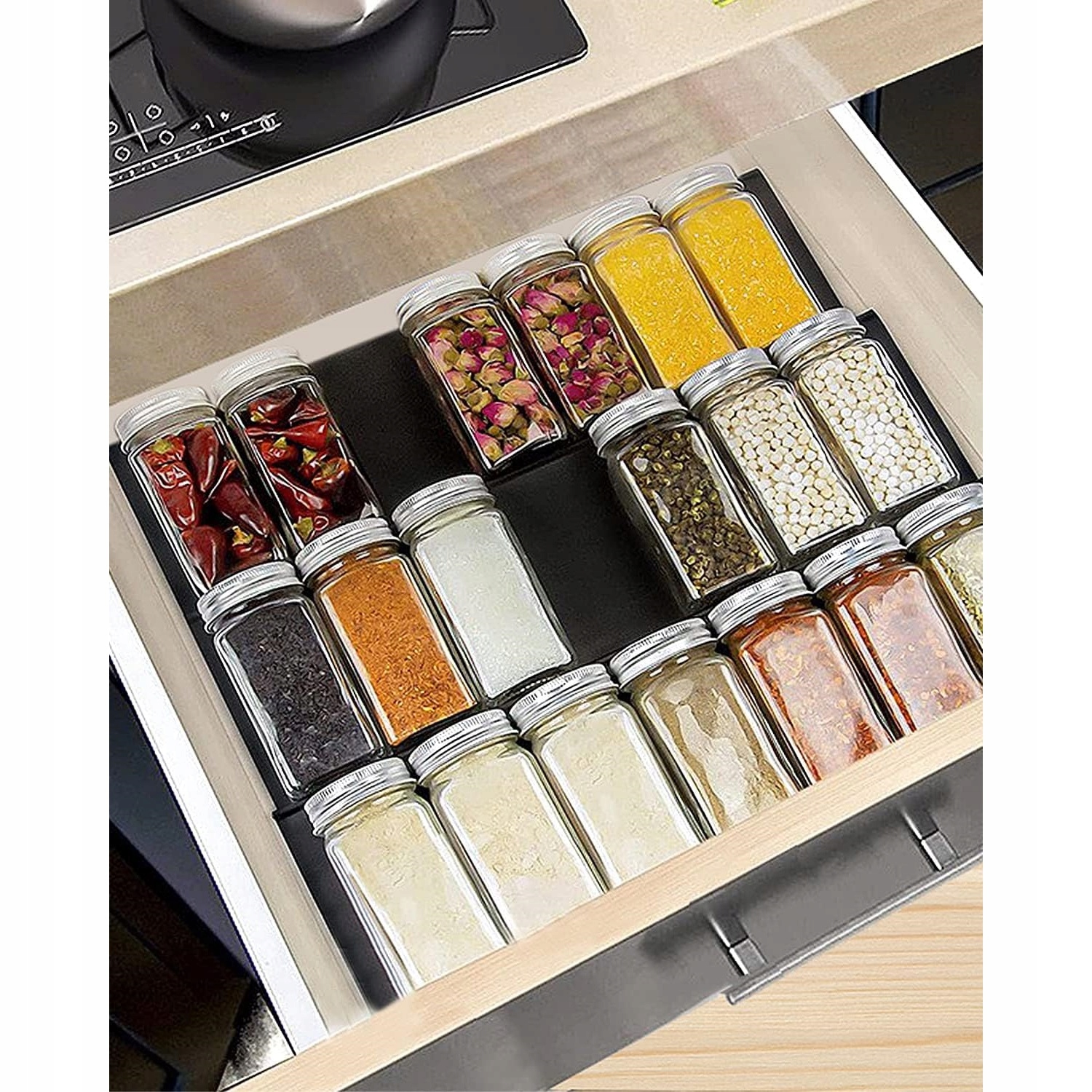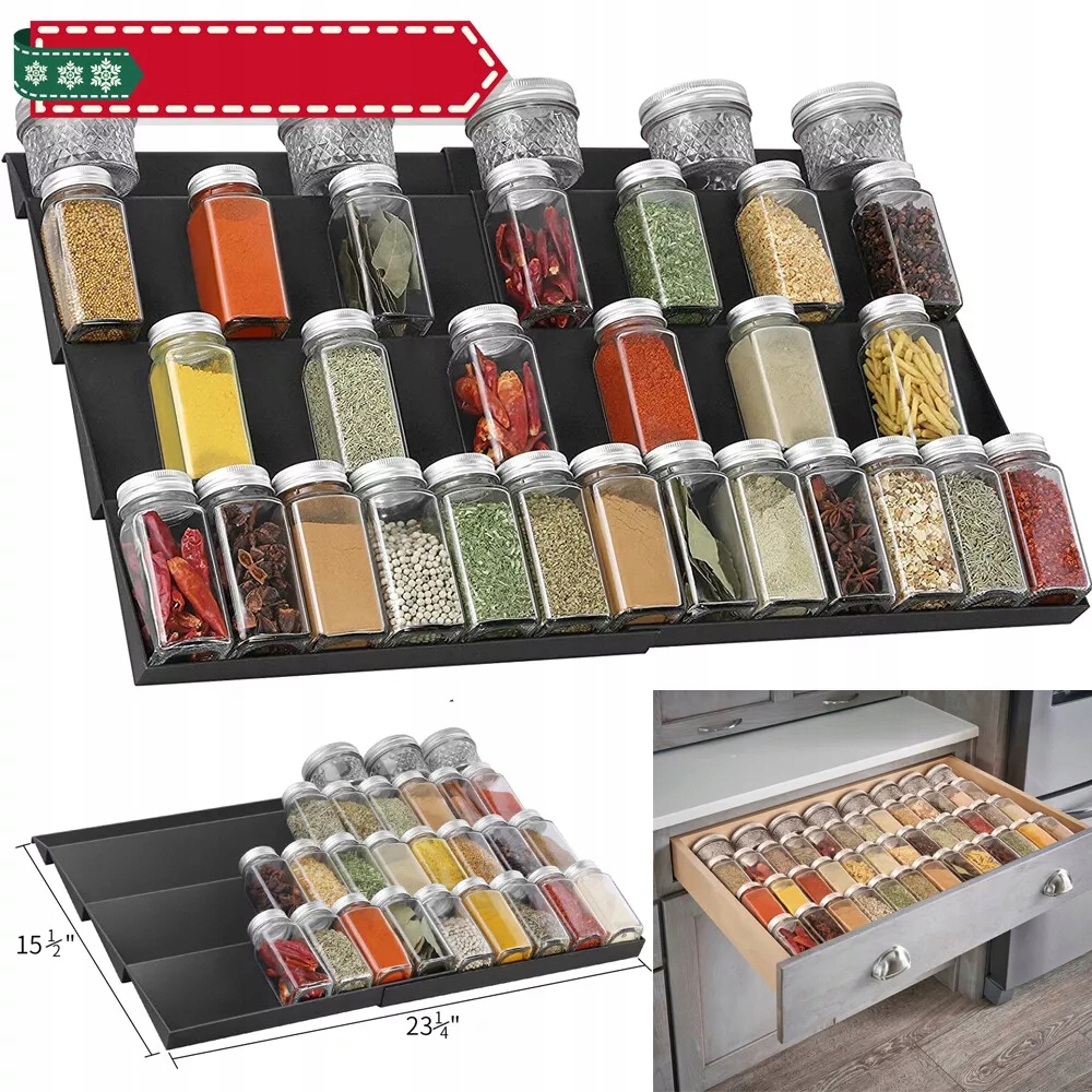🎀🎀🎀 Функціональне зберігання спецій: Наш набір включає 2 пластикові полиці для спецій. Кожна таця має довжину 39 см, мінімальну ширину 31 см і максимальну ширину 62 см. Висота органайзера 3 см. Наші підноси виготовлені з міцного пластику з елегантним дизайном і ребристою поверхнею. Вони не тріскаються, не гнуться, не змінюють колір, не ламаються і не розбиваються. Їх тонкий дизайн підходить для більшості розмірів ящиків завдяки регульованій конструкції.