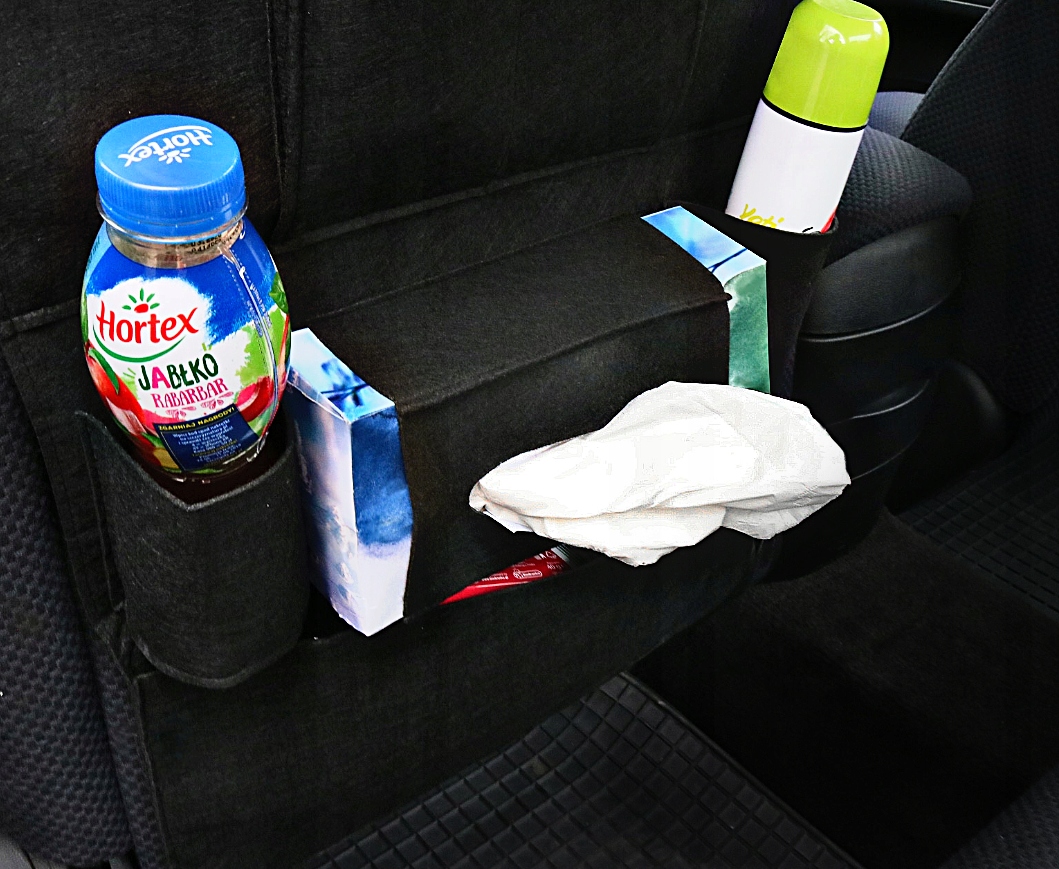 Отвори в дві сторони дозволяють легко засунути в нього коробку або сумку, а спеціально вирізаний отвір у центральній частині кишені дозволяє виймати окремі серветки, не витягуючи всю річ з органайзера. Дві вертикальні плоскі кишені, розташовані по центру, забезпечують простір для додаткових речей. Дві наступні крайні кишені ширші, і в них легко поміститися менша банка, пляшка з напоєм або дитяча пляшка.