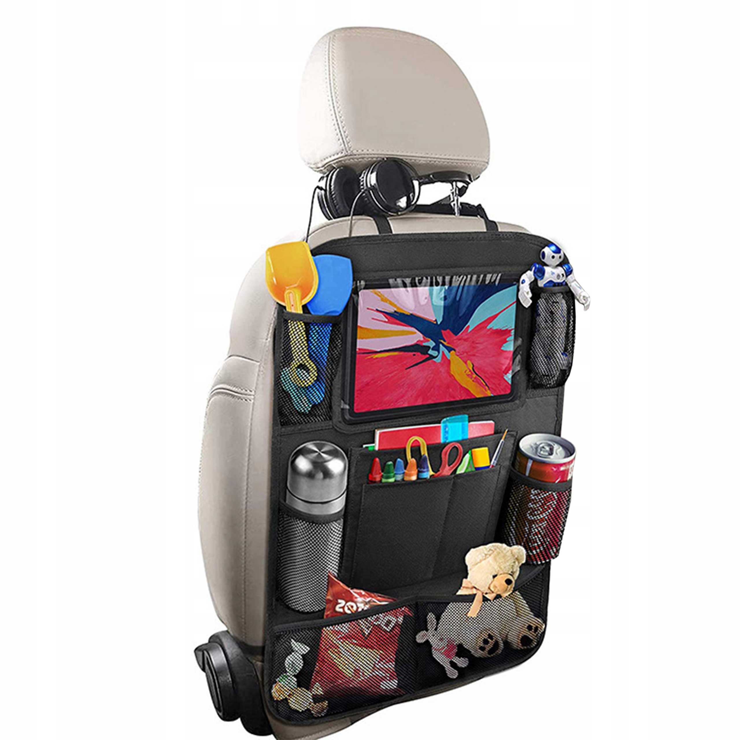 Встановлений на спинку сидіння, він пропонує багато відділень і кишені, які можуть вмістити все - від іграшок, через пляшки до електроніки.
