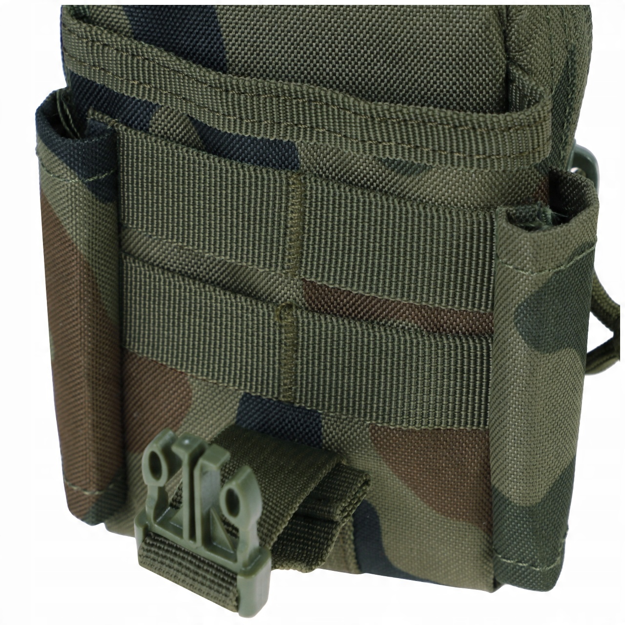 Крім того, на передній частині контейнера є гнучка кишеня для телефону або компаса, закривається на суцільну пряжку, застібка додатково фіксується липучкою. Піднос також має невелику вертикальну кишеню для ручки, ліхтарика або ножа з кліпсою. Завдяки системі MOLLE його можна прикріпити до пояса, рюкзака або набедренної сумки.