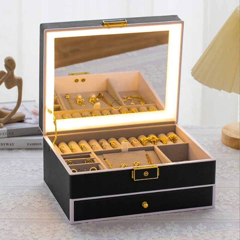 2-шар коробки для зберігання ювелірних виробів PU з світлодіодним дзеркала