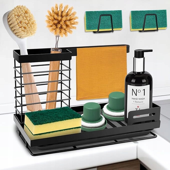 Наш тримач губки для кухонної раковини забезпечує багато місця для зберігання засобів для чищення кухні. Власник кухонної губки оснащений власником щітки різного розміру, рушником для підвісних ганчірків, губкою та куполом для пляшок та 2 ручками для кухонної губки. Розміри цього організатора для кухонної раковини - 24,3 см х 15 см х 16,5 см