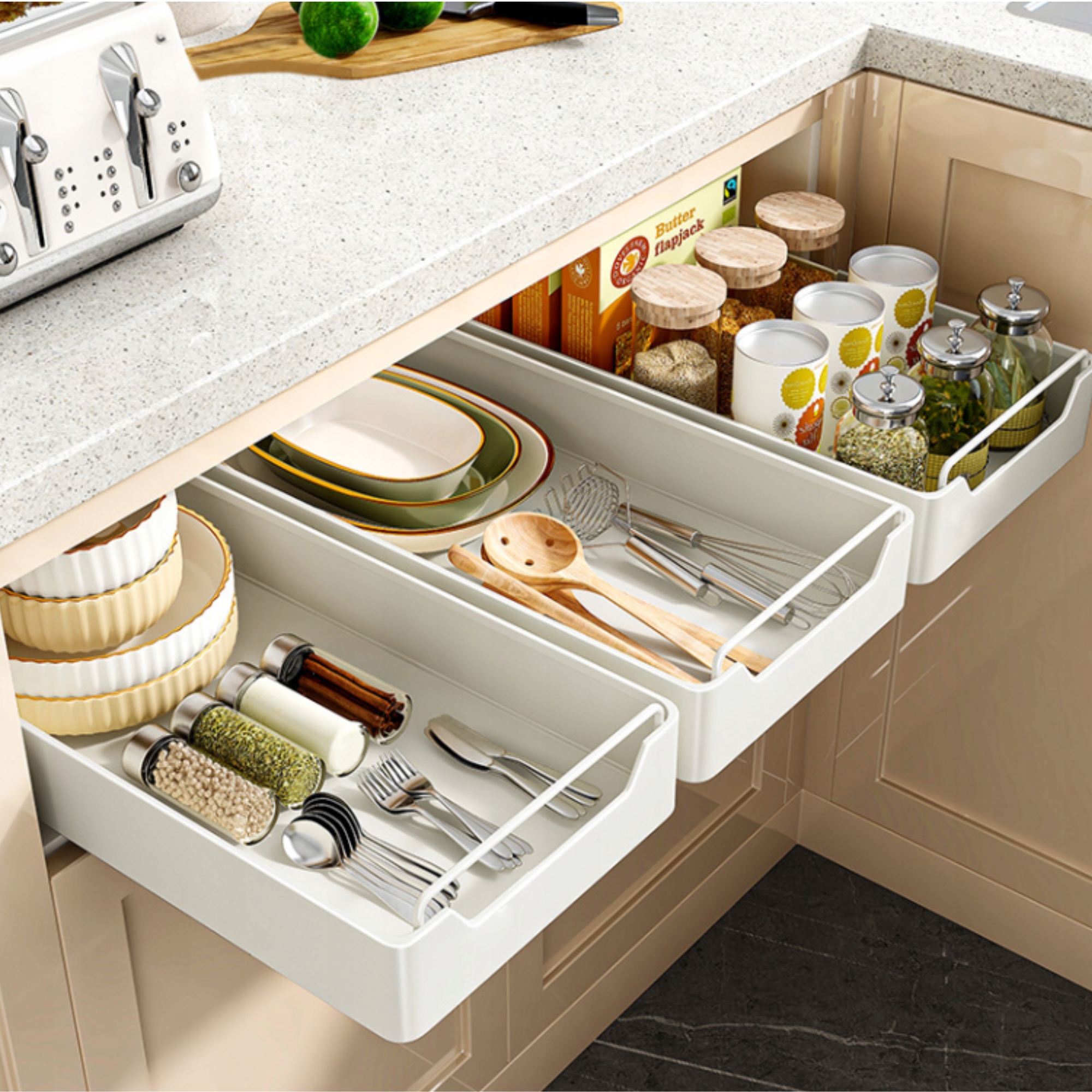 ☑ практичний організатор , що дозволяє організовувати не тільки банки зі спеціями, столовами та кухонними аксесуарами, але й косметикою, щітками або невеликими аксесуарами для ванної кімнати. Завдяки плавно висувних путівників вміст завжди під рукою, без необхідності шукати шафи. Можливість монтажу на самостійну стрічку або гвинти забезпечує гнучкість та простоту встановлення в різних просторах.
