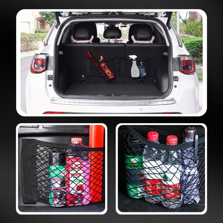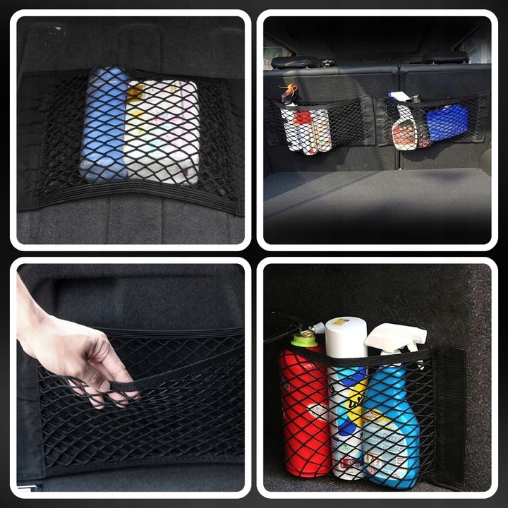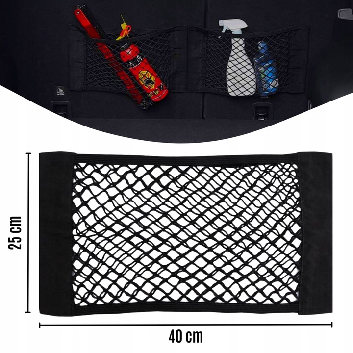 <> Організатор має міцне кріплення на липучках, що забезпечує легку та швидку установку в багажнику автомобіля. Гнучка сітка, яка дозволяє безпечно зберігати різні предмети під час руху.сітка липучка для багажника 40x25
