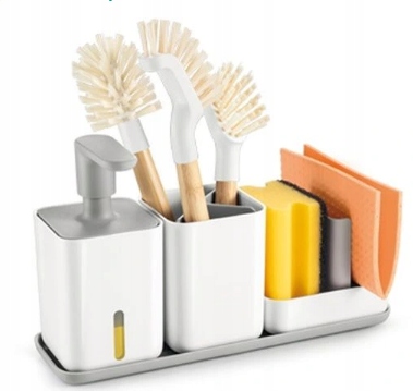 Вбудований набір для миття посуду з підставкою для зручного зберігання біля раковини. Легке наповнення та дозування засобу для миття посуду, знімні вставки в контейнері прискорюють висихання та полегшують очищення. Набір виготовлено з міцного пластику з нековзкою нижньою поверхнею.
