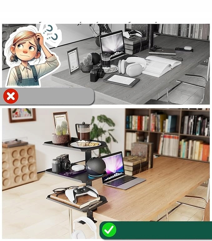 Функціональний настільний органайзер із затискачем, який дозволяє максимально використовувати робочий простір, не свердливши та не займаючи стільницю. Завдяки трьом рівням зберігання у вас є зручне місце для документів, книг, офісного приладдя, блокнотів і навіть невеликого електронного обладнання. Стійкий затискач дозволяє швидко встановити на край столу - ідеально підходить для дому, офісу та студентської кімнати.
