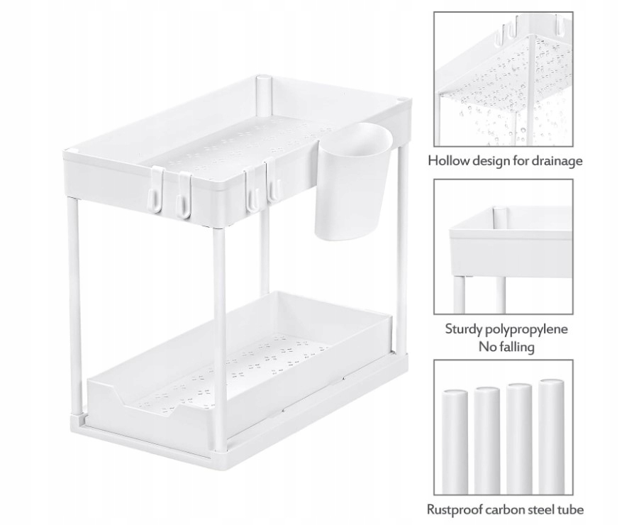 ОРГАНІЗАТОР ПІД МИЙКУ, 2 РІВНІ, ВИСУВНА ПОЛИЦЯ, КУХОННА ПІДСТАВКА, БІЛИЙ