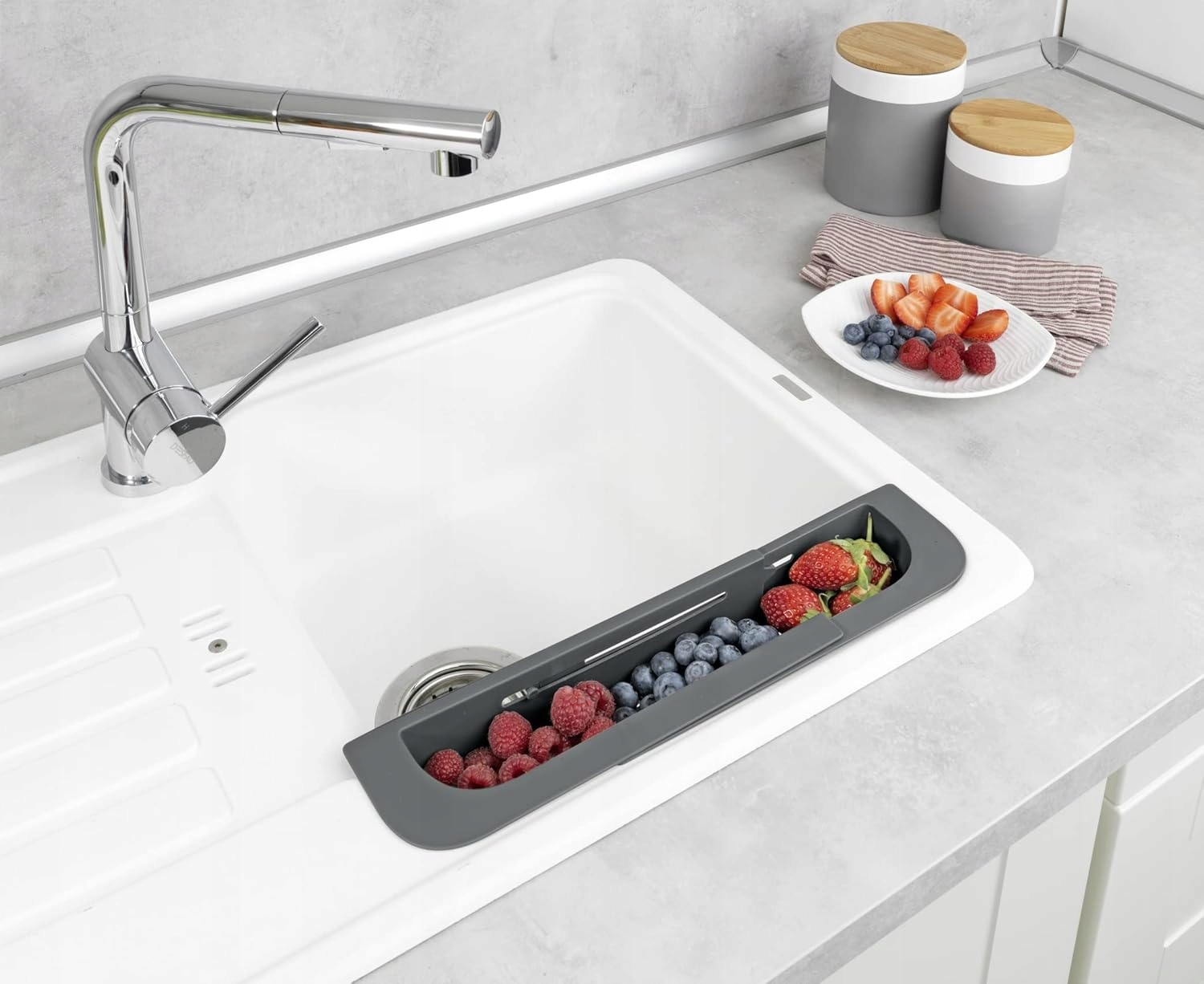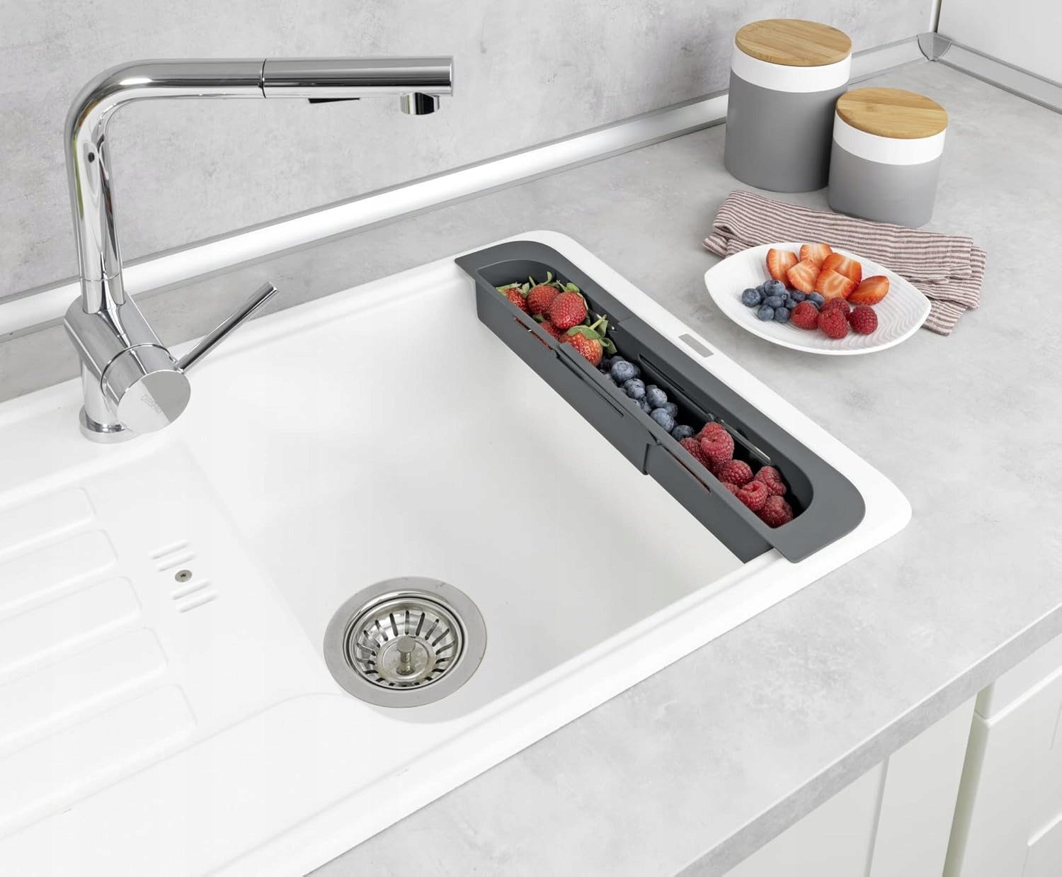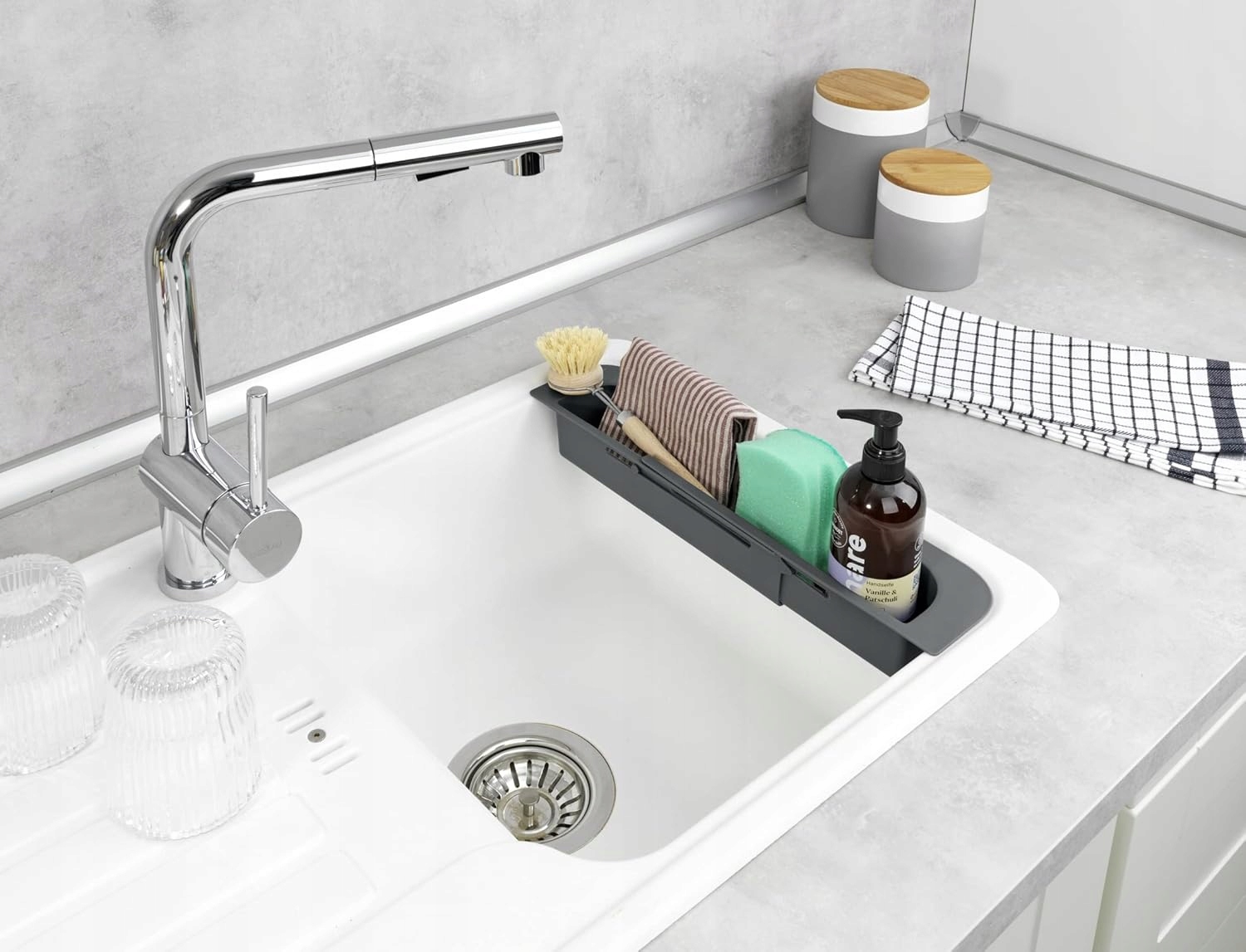 ✅ Повна гнучкість: полиця може бути плавно розширена та адаптована до ваших потреб, досягаючи довжини до 49,5 см. Ідеально підходить для будь -якої мийки та забезпечує максимальне використання наявного простору.