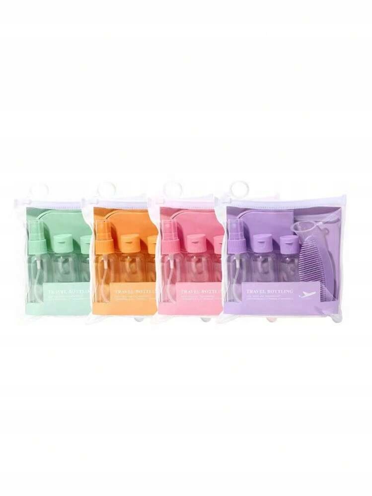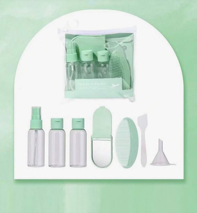 Тема продажу - це організатор подорожей з м'ятними вставками, складається з: 3 пластикових пляшок потужністю 50 мл, гребінця, дзеркала, воронки, шпателя.