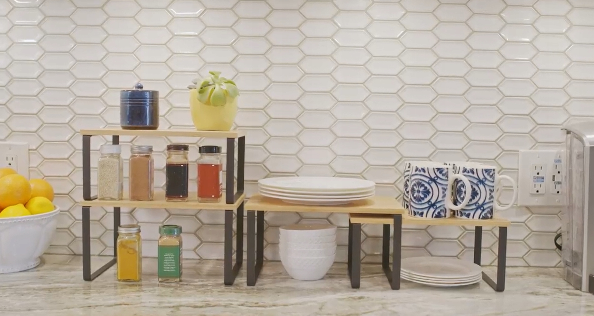 На кухні: розмістіть ці полиці в шафі або на кухонній стільниці, щоб більше місця для зберігання та більше можливостей для банок для спецій, склянок, мисок тощо.