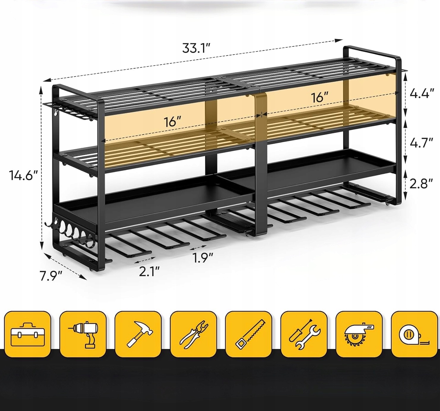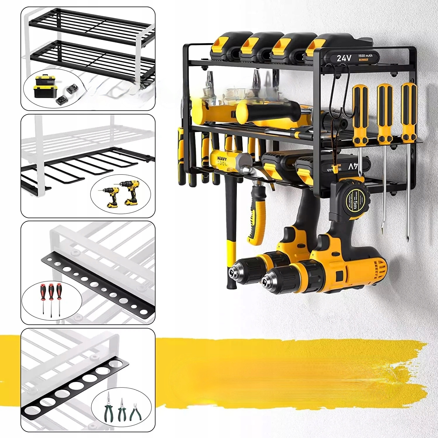 Великий настінний органайзер для зберігання електроінструментів і аксесуарів - ідеальне рішення для гаража, майстерні або інструментальної кімнати. Конструкція дозволяє підвішувати до 8 дрилів, а чотири підсобні рівні забезпечують оптимальне розташування обладнання та ручних інструментів. Міцна сталева рама гарантує стабільність і довговічність.