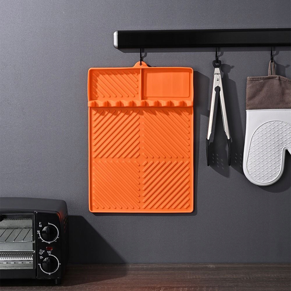 Органайзер виготовлений із протиковзкого силікону з неправильним, увігнуто-опуклим малюнком, який стабільно утримує великий посуд, запобігаючи щоб вони не рухались і не тремтіли. Ефективно запобігає розливанню олії та супу, зберігаючи гриль і столик чистими під час готування. Після приготування на грилі чистка килимка стає легкою: просто протріть його водою з милом або помістіть у посудомийну машину, щоб підготуватися до наступної кулінарної пригоди.
