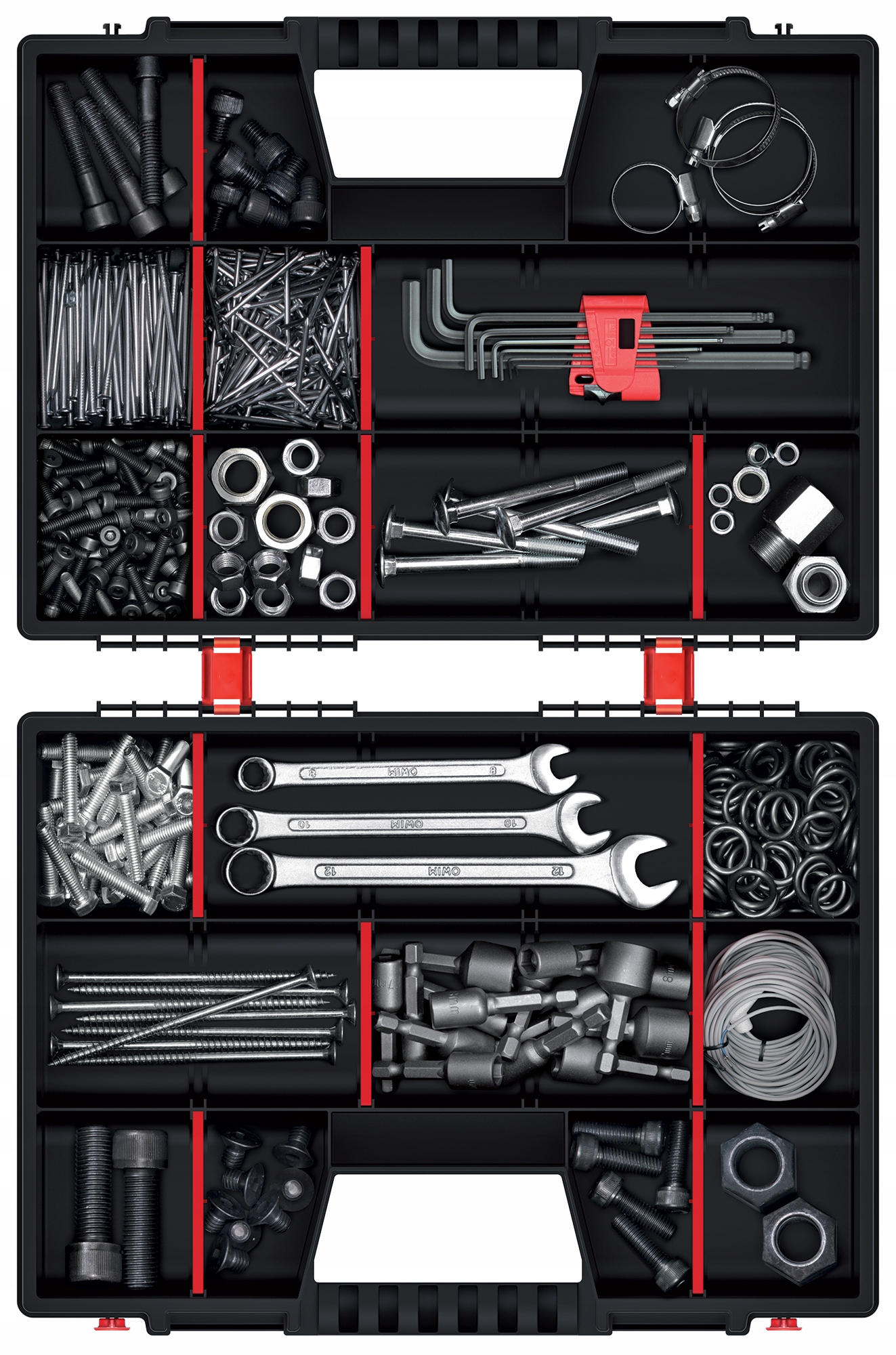 Органайзер NOR16DUO складається з двох коробок NOR16 кришками одна до одної. Завдяки цьому ми можемо ретельно захистити вміст. Вони з'єднані двома петлями і двома застібками.