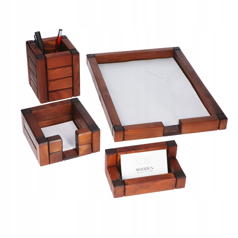 набір аксесуарів з дерев’яного столу. Вкладки для нотаток, візитна картка, чашка для ручок. 4 Кожен продукт - це поєднання окремих, з'єднаних дерев’яних модулів. Цей загальний знаменник дозволяє здійснювати будь -яку комбінацію окремих аксесуарів у набори, як частина кожного з запропонованих колекцій.