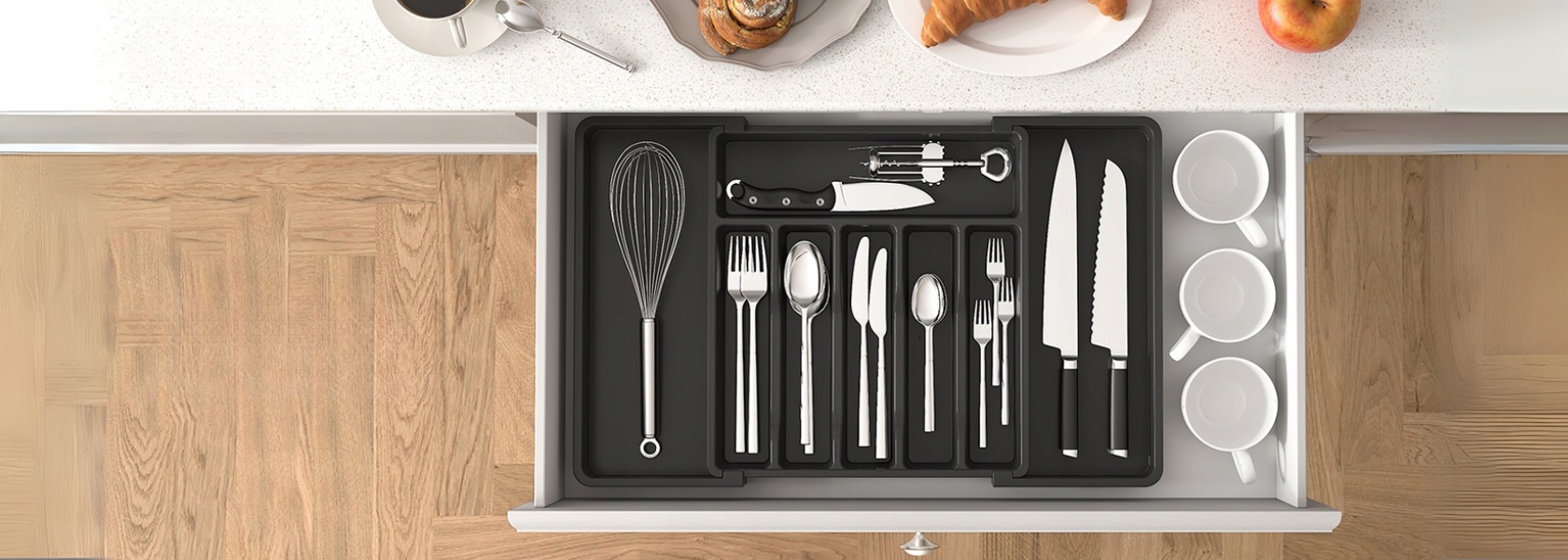 Отримайте більше місця та ідеально впорядкуйте столові прибори завдяки розширюваному органайзеру з 8 відділеннями. Ідеально підходить для різних ящиків - максимум функціональності в елегантному стилі.