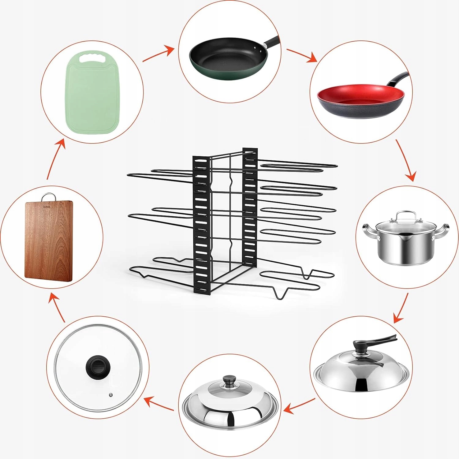 【 Міцність і довговічність 】 – наші тримачі для сковорідок виготовлені з високоякісного заліза. 8 регульованих перегородок забезпечують стабільну та безпечну установку всіх типів кришок і каструль.
