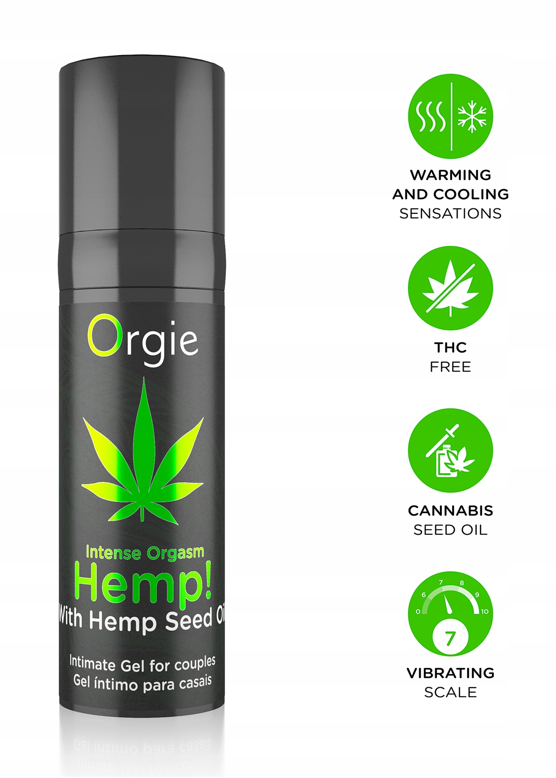 Коноплі! Intense Orgasmце стимулюючий інтимний гель з активними інгредієнтами, які забезпечують миттєвий ефект вібрації, відчуття зігрівання та охолодження в поєднанні з зволожуючими властивостями олії насіння коноплі та інші активні інгредієнти, які посилюють збудження та посилюють оргазм. Не містить THC або CBD.