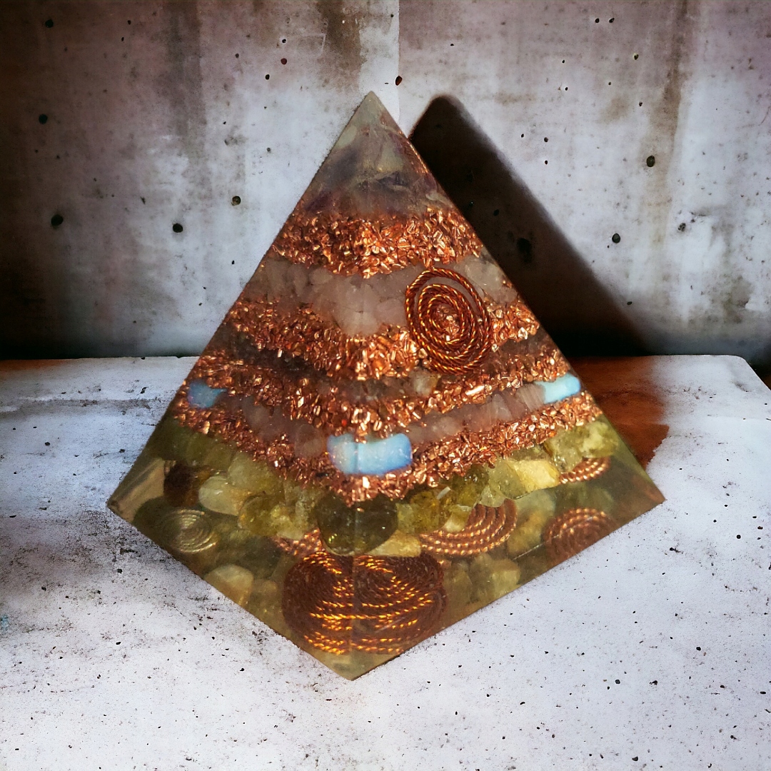 Orgonit Piramida Ochrony Oczyszczecia Fluoryt Kwarc Opalit Granat Zielony