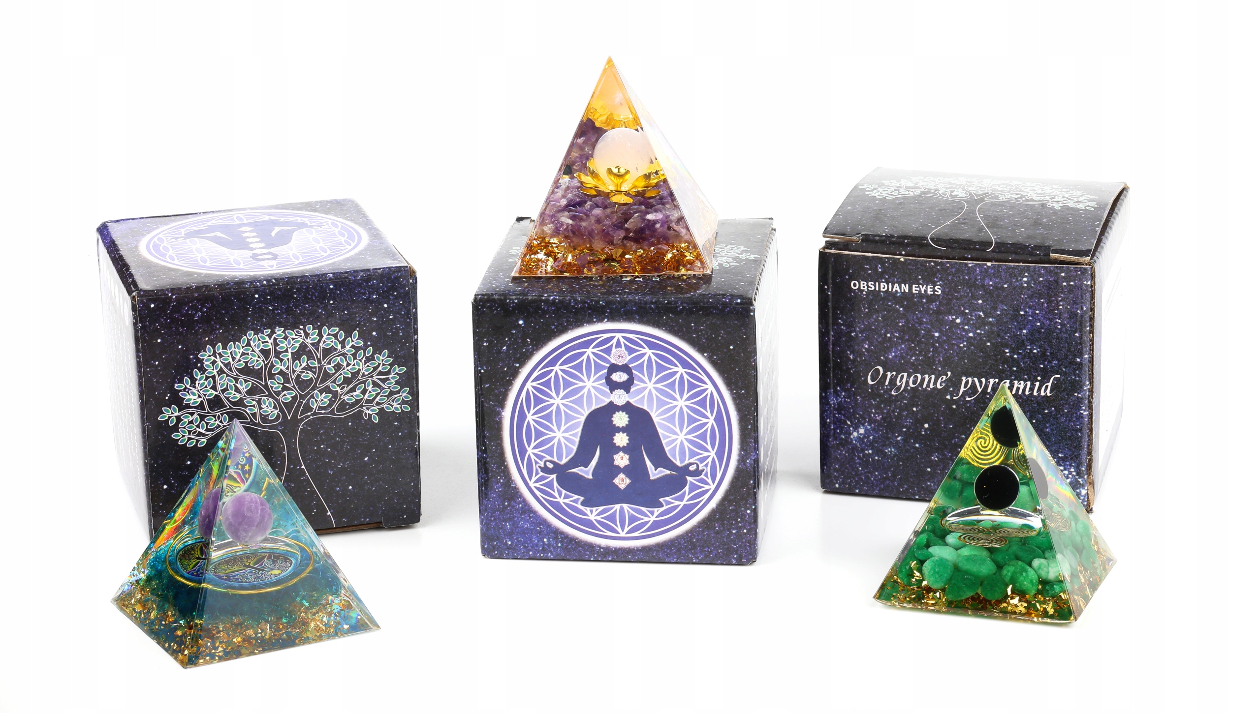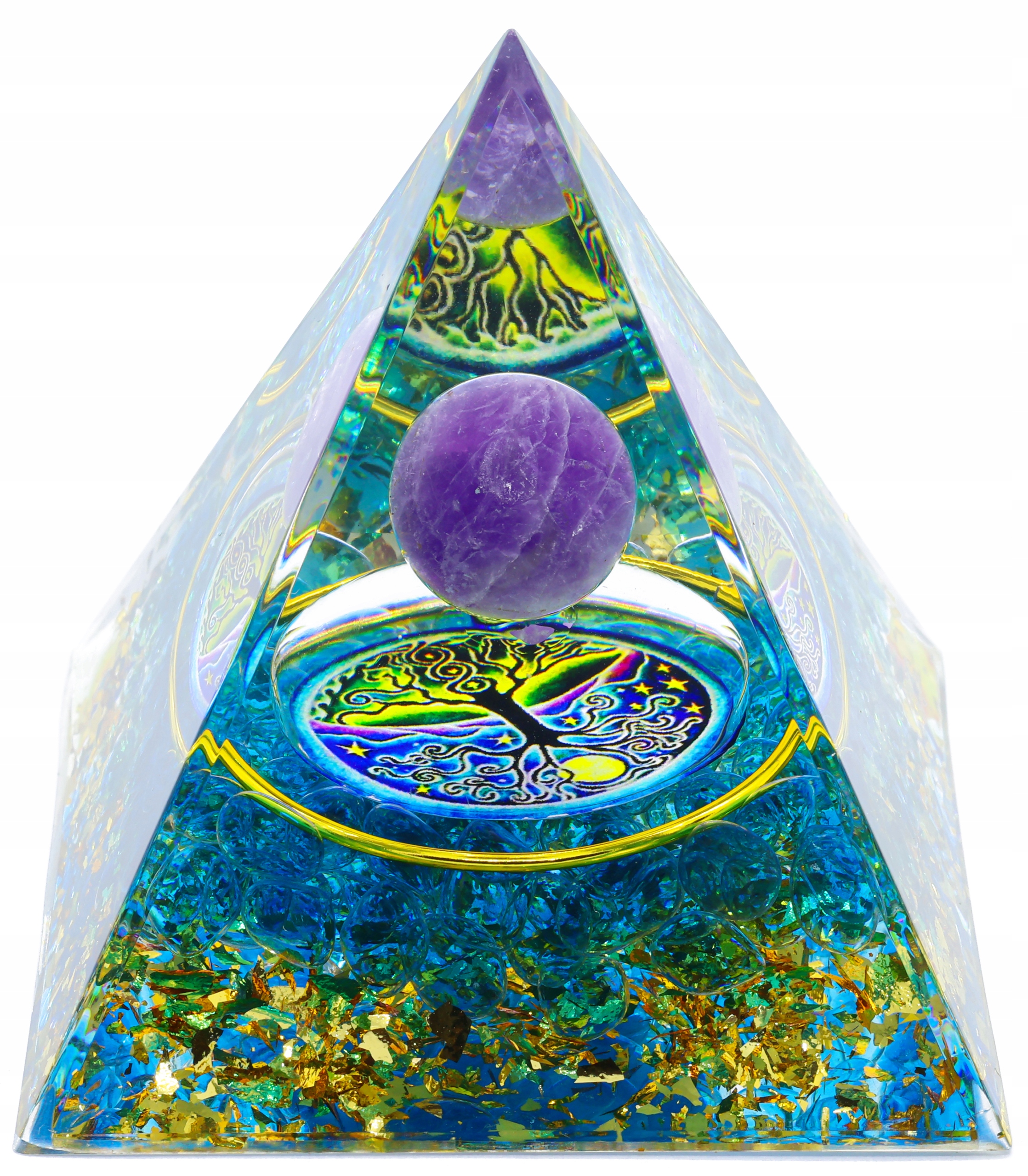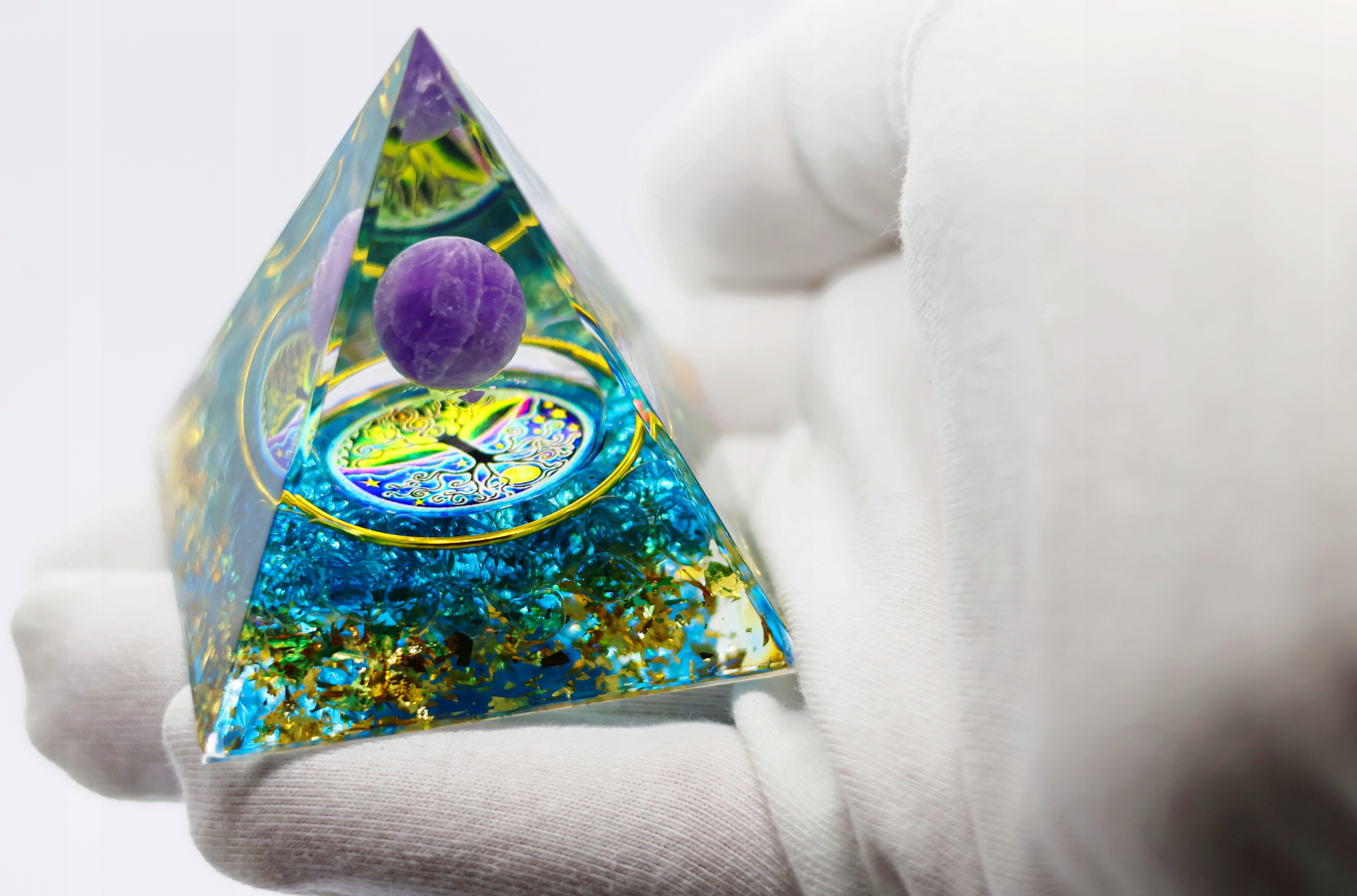 Кожна піраміда - це витвір мистецтва, зроблений вручну і кожна має свій індивідуальний характер. Це поєднання магії аквамарина, аметисту та оргоніту, що створює не лише гарний декоративний предмет, а й джерело позитивної енергії та захисту для вашого оточення. Будьте відкритими для магії та внесіть гармонію та баланс у своє життя!
